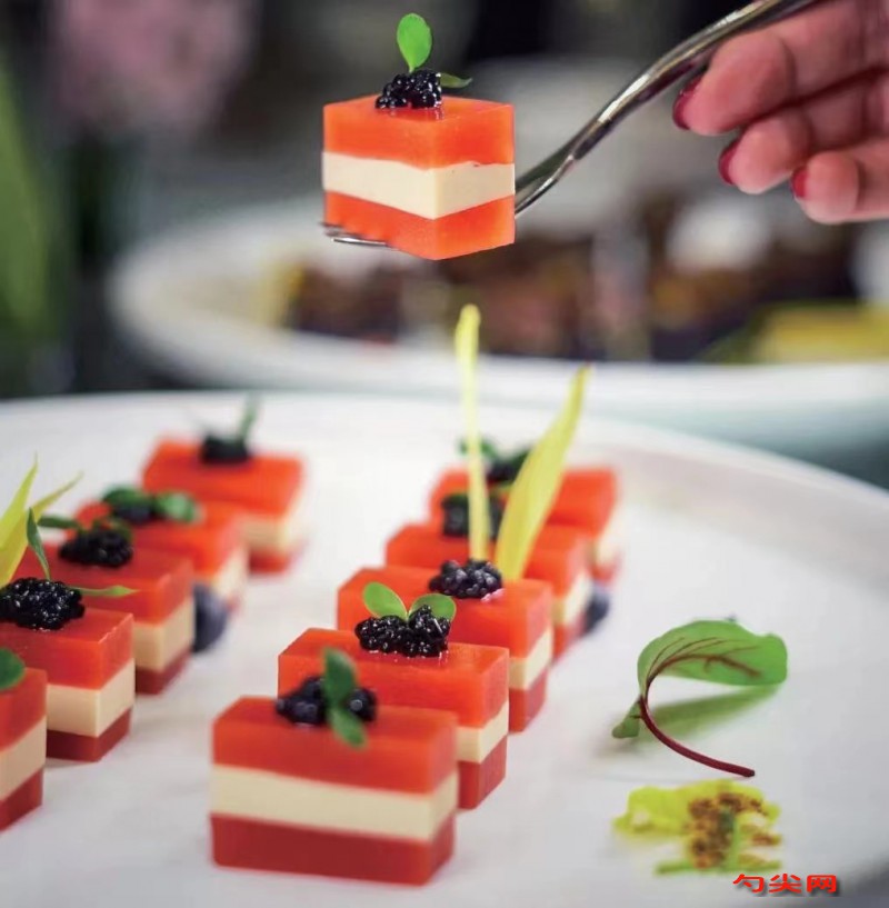 工藝:1.番茄洗凈,加濃縮檸檬汁、葡萄酒、白糖、番茄醬入料理機打成茸,去渣后將汁水倒入容器中,放在電磁爐上小火燒開,打去泡沫,加入泡好的凝膠片攪勻,備用。2.鵝肝解凍后用純牛奶浸泡12小時,撈出加姜、蔥、料酒、清酒、白糖, 味達蕾901號2克小火煮5分鐘,浸泡30分鐘后撈出,和奶油、巧克力、檸檬汁、葡萄酒、純牛奶、凝膠片一起放入料理機中打茸,備用。3.取保鮮盒,先放入一層熬好的番茄醬,入冰箱凍成型后取出,再放入一層打好的鵝肝醬,入冰箱凍成型,取出后再放一層番茄醬,入冰箱凍成型。4.走菜時,取出凍好的番茄鵝肝切成大小均勻的塊,擺入盤中,在每一塊成品上舀上魚子醬,稍加點綴即成。