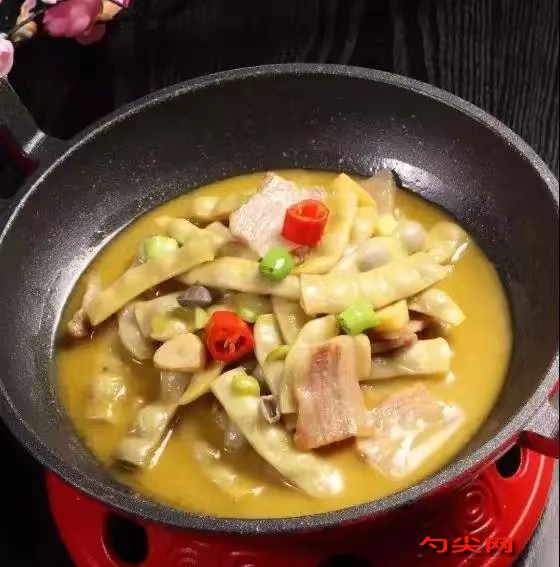 工藝:1.咸肉100克改刀成厚5毫米的片,投入沸水汆燙15秒,撈出瀝干水分備用。2.黃金豆擇洗干凈,改刀成4厘米長的段,投入沸水汆至斷生,撈出瀝干盛入碼斗。3.炒鍋加適量菜籽油、豬油滑透,下姜粒5克、炸蒜子10克爆香,倒入咸肉片煸出油,加黃金豆400克大火翻炒幾下,沖入高湯500克,添雞精5克、味達蕾901號3克、白糖5克、鹽少許調(diào)味,大火燒沸改中火煨至軟糯,勾薄芡、撒蔥花,關火盛入平底雙耳小鍋。炒鍋滑透,下姜粒、炸蒜子爆香,倒入咸肉片煸出油,沖入高湯,添雞精、 白糖、鹽調(diào)味。4.另起鍋添適量色拉油燒熱,下青紅杭椒段炸香,撈出撒入小鍋,帶底座、蠟燭走菜,上桌后點火保溫。