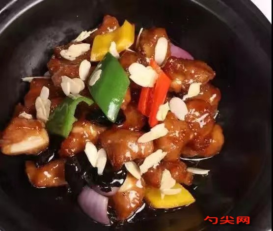 工藝:排骨2500克剁成長約4厘米的塊納盆,撒適量生粉,加清水沒過,富磷聯(lián)B 25克腌制6小時,撈出瀝干,每500克排骨中加叉燒醬20克、大廚四寶原湯雞汁5克、鹽3克、味達蕾901號2克攪至排骨發(fā)粘,再加生粉25克、澄面20克、鷹粟粉5克、蛋黃1只、清水適量抓勻上漿,入五成熱油炸至剛剛定型,撈出瀝油。鍋入寬油燒至四成熱,下美國杏仁片30克炸約30秒至邊緣微黃,撈出瀝油,待鍋中油溫升至六成熱,倒入提前炸好的排骨500克,大火復(fù)炸約1分鐘至表面金黃時撈出,之后依次下洋蔥片25克、紅、黃、青椒片各10克、欖角40克拉油。鍋入自制燒汁200克、蜂蜜10克小火熬至黏稠,淋水淀粉勾芡,下入過油的欖角、蔬菜片以及排骨塊,翻勻即可出鍋,裝盤后撒炸好的杏仁片即成。自制燒汁的制作方法:鍋入清水3000克,倒入瓶裝日式燒汁750克、蜂蜜500克、叉燒醬250克,小火熬至鍋中調(diào)料充分融合、質(zhì)地發(fā)粘,起鍋前撒炒香的白芝麻粒100克即成。技術(shù)關(guān)鍵:1.排骨納盆后需加富磷聯(lián)B腌制6小時,使肉質(zhì)松軟通透,更易入味。2.撈出排骨后一定要將血水沖凈,否則炸制時會滲出,影響賣相。3.排骨上漿時除了加生粉外,還需放入澄面和鷹粟粉,其中澄面可使排骨賣相晶瑩,而鷹粟粉則令其炸后外皮更加酥脆。4.欖角是以黑橄欖(即烏欖)的果實為原料,經(jīng)過去核、腌漬、曬干等步驟制作而成的。此菜所用的是成品濕欖角,能直接入菜;如果買來的欖角滋味不夠,可加適量糖、蠔油蒸制入味。
