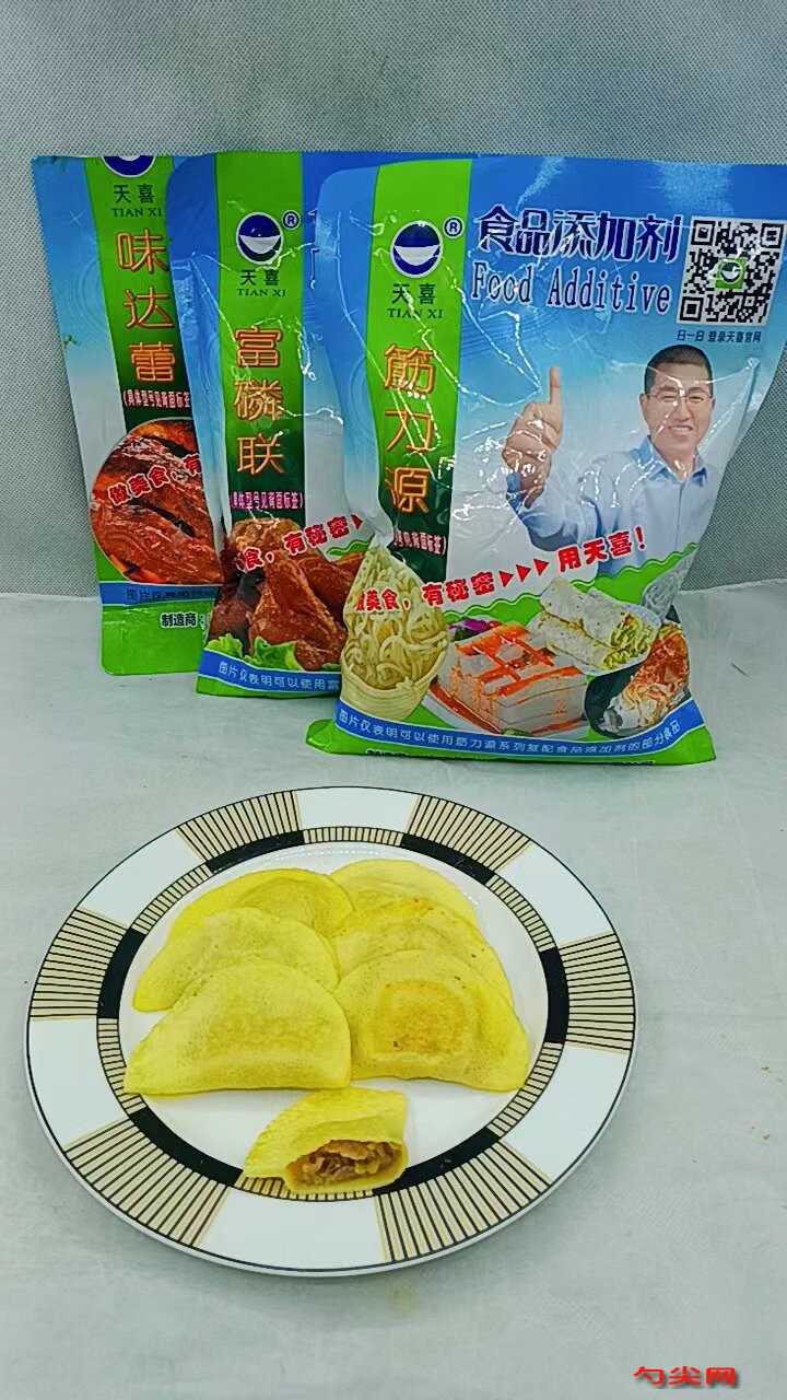 工藝:首先我們來調至肉餡,豬肉餡200克放入盆中,加入富磷聯C2克,這是正品包裝,它是天喜公司生產的復配食品添加劑,加入富磷聯C可以使肉餡嫩滑保水、抱丸不散,再加味達蕾901號2克,它是天喜公司生產的復配增味劑,可以讓肉餡更加鮮美。再加入蔥末10克,姜末10,生抽3克、料酒3克、五香粉2克、鹽5克、耗油3克,雞精2克,食用油10克,冰水40克分3次加入,每次等完全攪拌溶解后再加入下一次冰水,攪拌均勻腌制20分鐘,使肉餡更好的入味。碗中打入4個雞蛋,再稱取50克玉米淀粉,筋力源A08號1克 ,這是梁山天喜生產的復配食品添加劑,加入筋力源A08號可以防止速凍蛋餃干縮、裂口,與淀粉干拌均勻,再加入30克水,攪拌溶解,倒入雞蛋液中,繼續攪打均勻,鍋中刷少許油,倒入一小勺雞蛋液,攤平,整理成圓形,蛋液微微凝固時放上肉餡,將肉餡放在蛋餃皮的三分之一處,使用筷子挑起一邊,讓兩邊對折,然后使用筷子把邊緣按緊壓實,這樣咱們的蛋餃生坯就做好了,全部做好后,即可放入速凍庫(柜)-38度速凍!速凍40-50分鐘后移入-18度冷藏庫(柜),正常冷藏保存。 大家看,這是我們速凍好的蛋餃,無需解凍,擺入蒸籠中,溫水入鍋,蒸10分鐘。蒸熟即可出鍋銷售。