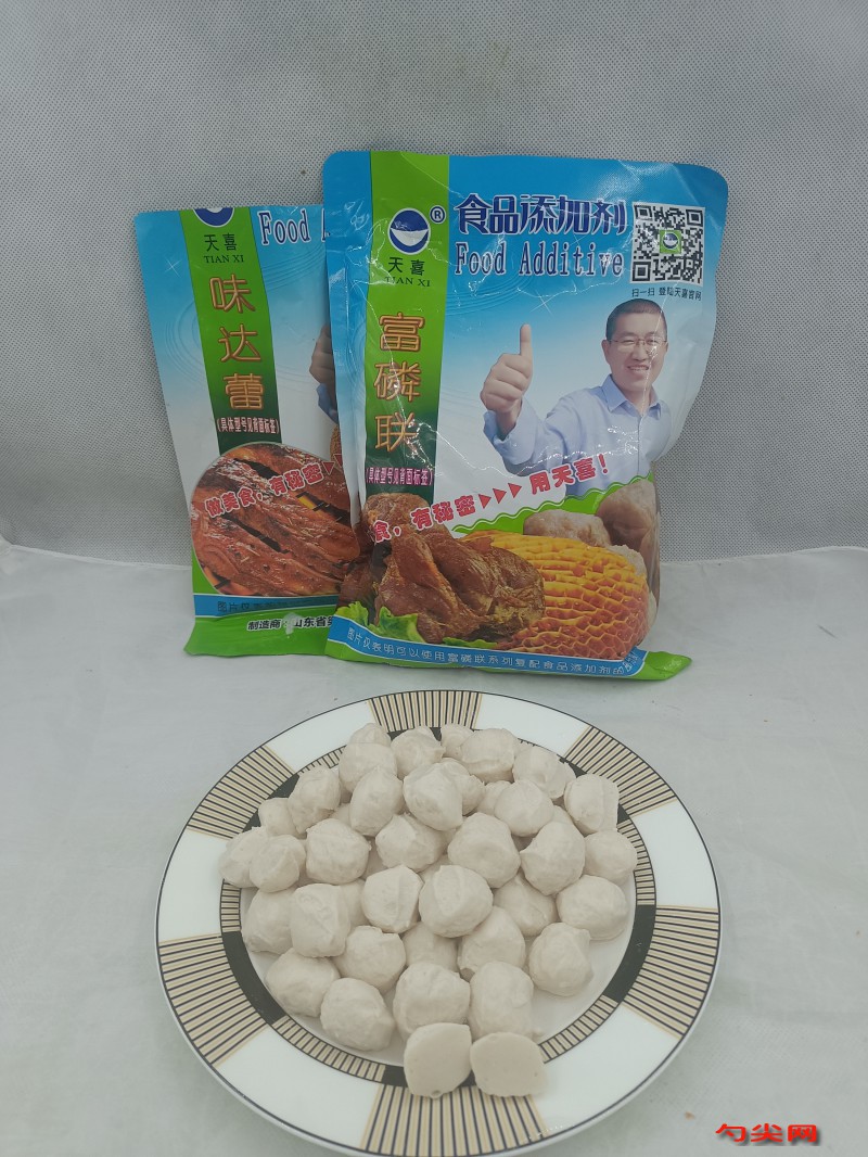 工藝:首先把切好的雞胸肉500克放入攪肉機,攪成肉泥備用。再倒入泡好的蔥姜水30克,打入兩個雞蛋清,食鹽2克攪拌均勻。稱取富磷聯C5克,它是梁山天喜生產的復配食品添加,加入富磷聯C可以使做出來的速凍嫩雞肉丸口感脆嫩筋道Q彈,嫩滑保水,抱丸不散,倒入肉餡中,稱取味達蕾901號2克, 它是梁山天喜生產的復配增味劑,可以讓雞肉丸更加鮮美,倒入肉餡中,然后加入料酒2克,玉米淀粉150克用手攪打上勁。攪至粘稠狀態即可。 鍋中燒水,用手擠出丸子,依次下入鍋中,小火煮,不要煮開,煮至丸子飄起即可,把煮好的丸子放入速凍庫(柜)-38度速凍!速凍40-50分鐘后移入-18度冷藏庫(柜),正常冷藏保存。這樣做的丸子QQ彈彈、口味鮮美,再次食用時無需解凍,可直接下入鍋中煮、炒、下火鍋都可以,煮熟后撈出即可食用。