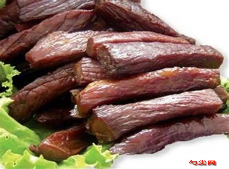 工藝:1、選料牛肉原料最好選擇健康、育肥的后腿和前腿瘦肉,表面為紅棕色,內(nèi)部結(jié)構(gòu)硬且富有彈性。2、將原料肉剔去皮、骨、筋健、脂肪、淋巴、血管等不宜加工的部分,順著肌纖維切成肉塊,用自來水沖洗30min,除去血水、臟物,瀝干后備用。3、將腌料配料混合均勻后與肉塊拌勻,腌制1.0 h。4、初煮將肉塊放入水中煮制,使肉塊完全浸沒,水溫保持在90℃以上,達(dá)到肉塊表面硬結(jié)、無血水。5、湯中可加入適量食鹽及少許調(diào)料,煮制過程中要及時撇去湯中的上浮污物和油沫,肉塊煮好撈出后放于攤晾架上攤晾,湯汁過濾備用。6、復(fù)煮配料;料酒,精鹽,雞精,白砂糖,五香粉,老抽,生抽,大蔥,生姜。7、復(fù)煮、收汁。取二分之一的初煮原湯,加入配料,用大火煮開,將切好的牛肉塊放在湯中煮制。待湯料減少并散發(fā)香味時,改用小火收湯,一般小火收汁1.0~2.0 h,待湯汁基本收干后起鍋。8、煮時用鍋鏟輕輕翻動,以使肉塊受熱均勻;湯汁將要熬干時,勤翻牛肉塊,以防焦鍋。出鍋后將肉塊置于攤晾架上攤開瀝干,冷涼。