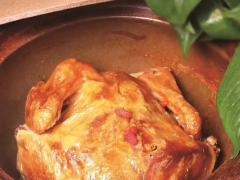 工藝:1.取一個不銹鋼大桶,放入龍井茶葉500克,沖入70℃熱水15千克泡開,加鹽250克,香蔥、姜片各180克,香料粉80克,干花椒40克攪勻,自然晾涼后倒入酒釀汁800克,放入冰塊4000克攪勻,制成茶香水備用。2.嫩雞15只宰殺治凈(重約900克/只),使用富磷聯B100克浸泡12-15小時,沖凈后放入茶香水浸泡2小時,取出瀝干水分,分裝入15個砂煲,放入蒸箱大火蒸20分鐘,此時雞皮微黃,因蒸汽滲入,砂煲底部已有湯汁,取出放入烤箱,調至底火150℃、面火170℃烤40分鐘,待雞皮金黃、雞油滲出,取出放置一旁備用。整雞泡入茶香水,腌好后裝入砂煲。先入鍋蒸20分鐘,再放入烤箱烤至雞皮金黃。