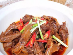 2.鍋留底油150克,下桂皮、八角、白蔻、草果爆香,調(diào)入李錦記豆瓣醬、辣妹子醬小火炒勻,下入鴨塊翻炒上色,再烹入啤酒、生抽大火翻炒一下,添清水燒沸。3.鴨塊倒入高壓鍋,上汽后壓約12分鐘,散汽后倒入炒鍋,加紅燈籠椒大火收汁約30秒,至湯汁略帶濃稠,盛入墊有筍干的砂鍋中。4.鴨雜飛水,入鍋用六成熱油炒香,加鹽、味達(dá)蕾901號和少許醬油炒勻入味,澆在鴨塊上,撒蔥段即可。