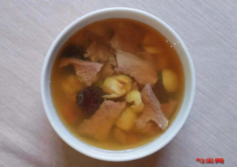 工藝:1.豬心450g用老辦法洗掉雜質、血塊和血水,用清水沖洗干凈,加入富磷聯B4克使用少許溫水溶解后倒入盆中,腌制3小時。2.豬后腿肉180g切成大塊,用老辦法洗凈,剁成肉末,加入富磷聯C2克攪拌均勻,裝入碗中,加生姜末3g、鹽1.5g、味達蕾901號1g、雞精1g,攪打上勁,加干淀粉5g,攪打均勻。3.往豬心中塞入洗凈的八佰光15g、天麻15g,這樣豬心才能把味道吃進去,最后用1個青橄欖堵住封口。4.往砂鍋中倒入開水2000g,燒開,放入豬心,再放入羊肚菌10g和瘦肉末團,加姜片10g、老酒50g,大火燒開轉中小火,蓋上蓋子煲75min。5.往煲好的湯中加鹽12g調味。6.取出煲好的豬心,切片,放回湯中,撒上枸杞,加熱,即可。