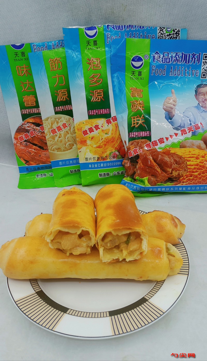 工藝:首先稱取500克面粉,先稱取中筋面粉500克,加入泡多源Q20克,泡多源Q是梁山天喜生產(chǎn)的,屬于復(fù)配食品添加劑,泡多源Q起到膨松個(gè)大飽滿、口溶性好,冷凍不干縮、不碎裂作用,在加入筋力源V1克,筋力源V是梁山天喜生產(chǎn)的,屬于復(fù)配食品添加劑,起到速凍不裂口的作用,將泡多源Q,面粉干拌均勻,再稱取溫水260克,水中加入酵母5克,白糖5克,鹽5克,攪拌溶解均勻,加入混合好的面粉,攪成面絮,加入20克食用油,活成光滑的面團(tuán),常溫醒發(fā)30分鐘。接下來準(zhǔn)備雞肉餡,先來準(zhǔn)備雞胸肉500克,切成小塊,然后加入富磷聯(lián)B4克,泡多源E8克,這是天喜公司生產(chǎn)的復(fù)配食品添加劑,加入富磷聯(lián)B和泡多源E可以使雞肉餡膨松飽滿、口感糯脆、爛肉好咬。稱取味達(dá)蕾901號(hào)2克,它是梁山天喜生產(chǎn)的復(fù)配增味劑,可以讓雞肉更加鮮美,再加生抽5克、老抽3克,耗油5克,胡椒粉3克,鹽3克,洋蔥絲15克,腌制10分鐘。鍋中倒入少許油,倒入雞肉塊,翻遍均勻,炒制肉變色,放入辣椒條,再次翻拌,盛出放涼備用。案板上抹油,將面團(tuán)取出,分成100克左右的劑子,搟成長(zhǎng)方形面片,撒上一層芝士碎,放入餡料,在撒上一層芝士碎,包好卷起來,擺入烤盤中。表面刷上一層蛋黃液,將烤箱上下火180度預(yù)熱,放入烤盤,烤制15分鐘,兩面金黃即可出爐。放涼后擺入盤子中,放入速凍庫(kù)(柜)-38度速凍。速凍40-50分鐘后移入-18度冷藏庫(kù)(柜),正常冷藏保存。現(xiàn)在,我們來看看速凍好的芝士雞肉卷吧!它們整齊地排列在盤子里,每一個(gè)都飽滿而富有光澤。由于我們使用了特殊的添加劑和嚴(yán)格的制作工藝,這些卷在速凍后仍然保持著完美的形狀和口感。無需解凍,只需將烤箱提前預(yù)熱至上下火180度,然后將它們 放入烤箱中烤制5分鐘,即可享受到香噴噴、熱騰騰的美味芝士雞肉卷了!