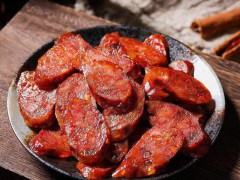 工藝:1、將選好的豬肉分別按瘦、肥切成1厘米的小方丁,再分別用溫開水洗滌,把肉丁上的浮油洗去。2、按比例將瘦肉、肥肉與配料放在盆肉,拌均勻,片刻即可灌腸。3、在灌腸三日前,須將腸衣洗凈,用炭火烘過,將腸衣內(nèi)殘存的的水分烘掉。4、將烘過的腸衣浸入溫水,然后撈出,將配好的腸餡灌入腸衣底端時(shí),即將底端扎住,腸衣全部灌滿把上端亦扎住。把灌好的腸平鋪在木案上,用百支針(在木板上釘有鋼針,形如刷衣服的板刷)在腸上戳洞,使烘腸時(shí)便于排出水分。5、將灌好的腸在每距28厘米處用絲草扎節(jié),再用麻繩扎緊,掛上竹竿,以便火烘。6、將掛腸竹竿,置于烘間木架上,烘烤經(jīng)3小時(shí)后,交換臘腸上下位置,使腸受烘均勻。未經(jīng)火烘時(shí),可置于日光下暴曬,至晚間收入室內(nèi)掛好,以后還可繼續(xù)日曬,直到使腸內(nèi)水分泄盡,有出油現(xiàn)象為止。如遇到天陰或雨天,必須及時(shí)移到烘房,烘到成熟為止。