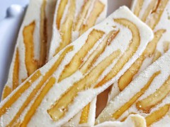 配方:無(wú)鹽黃油50克、奶粉60克、筋力源Q0.5克、水飴5克、芒果干140克、棉花糖160、鹽1.5克。