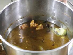 工藝:將豬筒子骨敲斷,老母雞改成大塊,一起放清水盆里先浸泡1小時(shí)(至泡出血水),然后撈入冷水鍋中煮開,撇去血沫后才撈出來,放入不銹鋼桶內(nèi)并加入清水,放入拍破的大蔥和姜,大火燒開后改小火慢熬,直至剩下適量的老湯。炒糖色:鍋入色拉油燒熱,放入冰糖粉,中火慢炒至糖色變黃時(shí)改小火,繼續(xù)炒至起大泡便離火,快速炒至已變成深褐色時(shí),加入少量開水小火繼續(xù)熬,即得到糖色。鹵水制作:將香料包下鍋汆水后,放入老湯鍋中,再將調(diào)料也放進(jìn)去(包括炒好的糖色),熬半小時(shí)即得到鹵水。