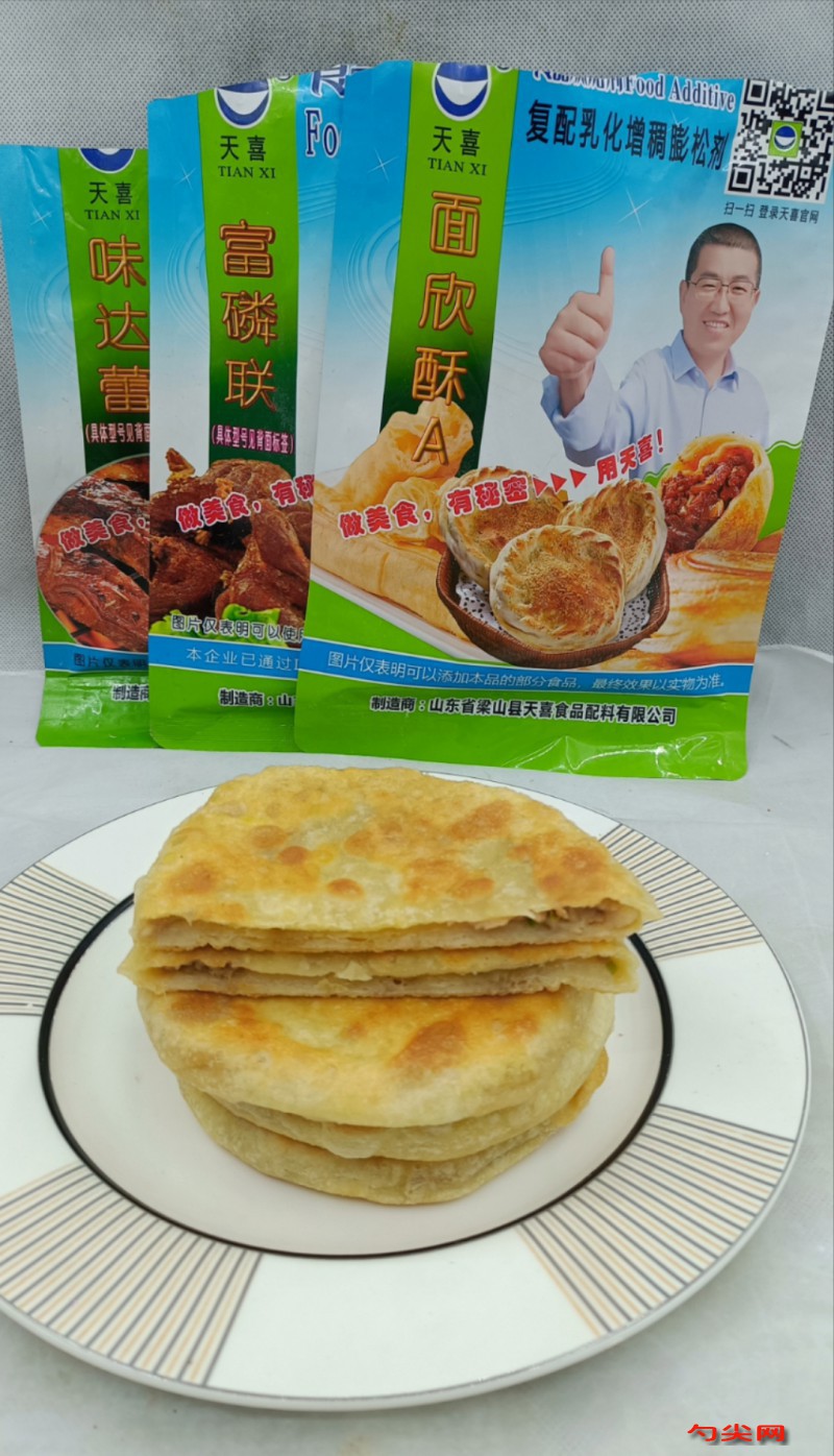 工藝:首先盆中稱取500克中筋面粉,面欣酥A 2.5克,這是梁山天喜生產復配食品添加劑,加入它們可以使酥皮餡餅蓬松個大飽滿,外酥里軟。一起倒入面粉中與面粉干拌均勻,加入300克溫水進行和面,下手揉成一個偏軟的面團,再加入液體起酥油20克,再次揉均勻,密封醒面30分鐘,將醒好的面團搓成長條,切分成60克左右的小劑子,揉成光滑的面團,表面刷一層油,鎖住水分,同時也能使醒好的面劑延展性更好一些,再次醒發10分鐘,我們的面團就準備好了。接下來,我們來調制肉餡,把豬肉餡300克裝入盆中,加入富磷聯C3克,這是正品包裝,它是天喜公司生產的復配食品添加劑,加入富磷聯C可以使肉餡嫩滑保水、抱丸不散,再加味達蕾901號2克,它可以讓肉餡更加鮮美。再加適量的蔥花,姜末,鹽,十三香,生抽,耗油,攪拌到有粘稠狀時,腌制10分鐘,讓肉餡更好的入味。現在,我們開始制作餡餅。取一個醒好的面劑,按成圓餅狀,用搟面杖搟成薄片,包入肉餡,將口收緊,再用虎口收一收,多余的面劑掐掉。這樣,一個酥皮餡餅生胚就做好了。現在咱們開始煎,鍋中油溫160度預熱,下入餅坯,煎至底部金黃翻面,繼續煎至兩面金黃即可出鍋。
