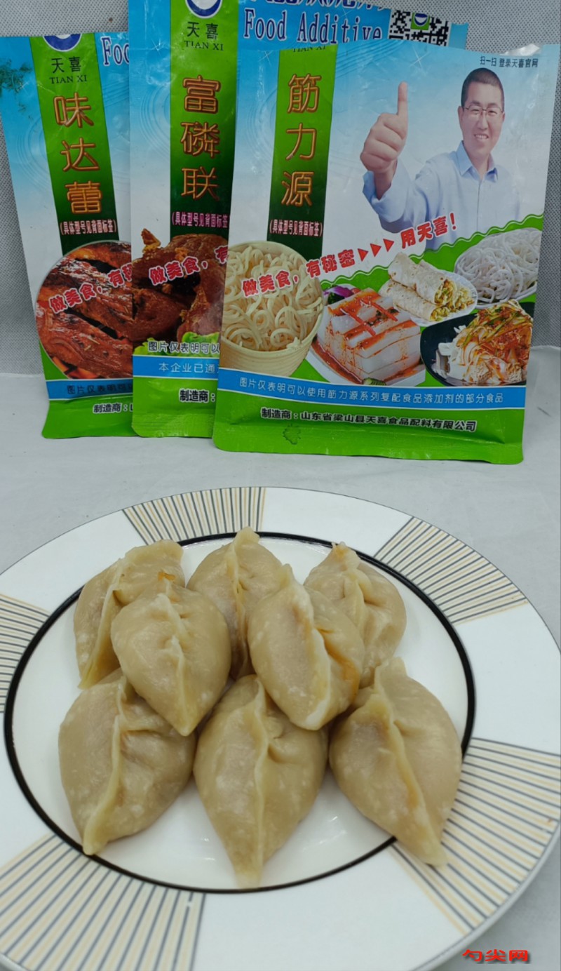 工藝:首先,我們要準備500克中筋面粉,加入食用鹽兩克,加入300克開水進行燙面,攪拌無顆粒面團,再下手揉成面團放,放置溫熱不燙手,再稱取50克面粉,筋力源L5克。它由梁山天喜公司生產的復配食品添加劑,能讓燙面角口感筋道,不裂口,倒入面粉中與面粉干拌均勻,然后和面團揉搓在一起,靜止20分鐘。接下來,我們要開始制作肉餡。將300克豬肉餡放入盆中,加入3克富磷聯C。這是天喜公司生產的復配食品添加劑,它能讓肉餡更加嫩滑、保水,且不易散開。接著加入味達蕾901號2克,使肉餡更加鮮美。將以上調料與肉餡混合均勻后,再加入適量的蔥花姜末、鹽、十三香、生抽和耗油,最后加入20克食用鹽,攪拌至肉餡變得粘稠,然后腌制10分鐘,讓肉餡更加入味。將靜止好的面團取出,揪成劑子,搟成面皮,包入肉餡成型。放入蒸籠中大火蒸20分鐘。蒸熟后出鍋,即可銷售。這樣,我們的燙面角就制作完成了。