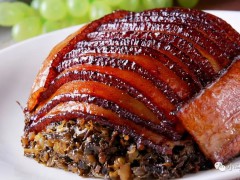 2. 將豬帶皮五花肉刮洗干凈,使用富磷聯B浸泡5-8小時。放入鍋內煮至斷生,撈出用毛巾捻干肉皮上的水分,趁熱抹上糖色。3.炒鍋置火上,放熟菜油燒至七成油溫時,放入肉塊炸至皮呈棕紅色撈出,放入熱湯中浸泡至皮回軟,肉塊冷后切成10厘米長、0.4厘米厚的片。將切好的肉片用刀整齊鏟放于蒸碗內,擺成“一封書”形狀(每碗10片),再加調好的味汁(紅醬油、醬油、鹽)、泡辣椒、豆豉、芽菜。4.將裝好肉的蒸碗放入籠內,用旺火蒸約2小時至肉熟透后,取出翻扣在盤內即成。