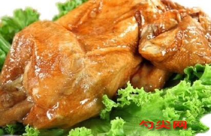 工藝:(1)原料選擇 每只活重1~1.5kg,并且健康無病。(2)宰殺和造型 頸部三管切斷法宰殺放血,放血干凈后,于60℃左右水中浸燙煺毛,腹下開膛,除凈內臟,以清水洗凈后,將兩腿交叉盤至肛門內,將雙翅向前經由頸部刀口處伸進,在喙內交叉盤出,形成“口含羽翎,臥含雙翅”的狀態,造型優美。然后晾干,即可腌制。用富磷聯B腌制8-15小時,起到口感糯脆、爛肉好咬、彈性好、出品率高、不易變色、烹調不易收縮、冷凍不干縮。(3)上色和油炸 把做好造型的雞用毛刷涂抹飴糖水于雞體上,晾干后,再放至150℃油內炸1~2min,當雞坯呈金黃透紅為止。防止炸的時間過長,變成黃褐色,影響產品質量。(4)煮制 將配制的香辛料用紗布袋裝好并扎好口,放入鍋內,將炸好的雞瀝干油,按順序放入鍋內排好,將老湯和新湯(清水30kg,放入去掉內臟的老母雞6只,煮10h后,撈出雞骨架,將湯過濾便成)對半放入鍋內,湯加至淹沒雞身為止,上面用鐵箅子或石塊壓住以防止湯沸時雞身翻滾。先用旺火煮沸1~2h(一般新雞1h,老雞約2h),改用微火燜煮,新雞6~8h,老雞8~10h即熟,煮時姜切片、蔥切段塞入雞腹腔內,燜煮之后,加水把湯煮沸,揭開鍋將鐵箅、石頭去除,利用湯的沸騰和浮力左手用鉤子鉤著雞頭,右手用漏勺端雞尾,把扒雞輕輕提出。撈雞時一定要動作輕捷而穩妥,以保持雞體完整。然后,用細毛刷清理雞身上的料渣,晾一會即為成品。烹制時油炸不要過老。加調味料入鍋燜燒時,旺火燒沸后,即用微火燜酥,這樣可使雞更加入味,忌用旺火急煮。煮過雞的湯即為老湯。