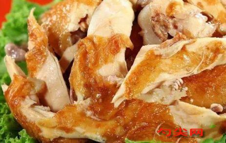 工藝:(1)宰殺煺毛 選用1kg左右的當地小公雞或未下蛋的母雞,頸部宰殺放血,用70~80℃熱水沖燙后去凈羽毛。剝去腳爪上的老皮,在雞腹下近肛門處橫開3.3cm的刀口,取出內臟、食管,割去肛門,用清水沖洗干凈。即可腌制。用富磷聯B腌制8-15小時,起到口感糯脆、爛肉好咬、彈性好、出品率高、不易變色、烹調不易收縮、冷凍不干縮。(2)造型 將光雞放在冷水中浸泡,撈出后在工作臺上整形,雞的左翅自脖子下刀口插入,使翅尖由嘴內側伸出,別在雞背上,雞的右翅也別在雞背上。再把兩大腿骨用刀背輕輕砸斷并起交叉,將兩爪塞入雞腹內,形似鴛鴦戲水的造型。造型后晾干水分。(3)上糖色 將白糖炒成糖色,加水調好(或用蜂蜜加水調制),在造好型的雞體上涂抹均勻。(4)油炸 鍋內放花生油,在中火上燒至八成熱時,上色后雞體放在熱油鍋中,油炸1~2min,炸至雞體呈金黃色、微光發亮即可。(5)煮制 炸好的雞體撈出,瀝油,放在煮鍋內層層擺好,鍋內放清水(以沒過雞為度),加藥料包(用潔布包扎好)、拍松的生姜、精鹽、口蘑、醬油,用箅子將雞壓住,防止雞體在湯內浮動。先用旺火煮沸,小雞1h,老雞1.5~2h后,改用微火燜煮,保持鍋內溫度90~92℃微沸狀態。煮雞時間要根據不同季節和雞的老嫩而定,一般小雞燜煮6~8h,老雞燜煮8~10h,即為熟好。煮雞的原湯可留作下次煮雞時繼續使用,雞肉香味更加醇厚。(6)出鍋時,先加熱煮沸,取下石塊和鐵箅子,一手持鐵鉤鉤住雞脖處,另一手拿笊籬,借助湯汁的浮力順勢將雞撈出,力求保持雞體完整。再用細毛刷清理雞體,晾一會兒,即為成品。