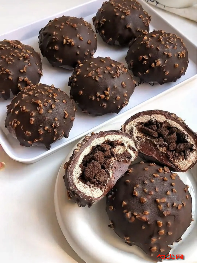 3.將融化的巧克力均勻涂抹在雪媚娘外皮上,使其表面形成一層薄薄的脆皮,為整體口感增添酥脆感。四、精心組裝與成型1.將雪媚娘外皮搟成薄片,切割成合適大小的圓形。2.在每個圓形外皮上擠入適量的淡奶油,然后撒上水果粒或奧利奧碎。3.用外皮包裹住餡料,封口朝下放入紙托中,確保形狀美觀且餡料不外露。4.最后,再次涂抹脆皮夢龍巧克力外皮,使其表面形成一層誘人的脆皮。