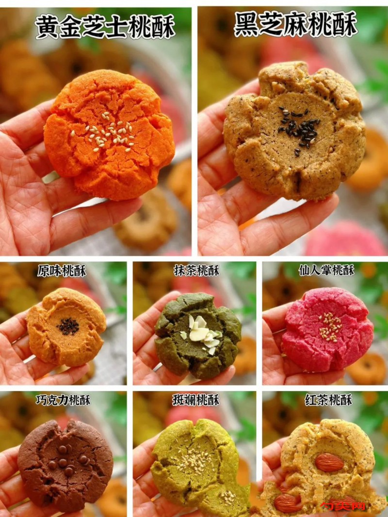 抹茶桃酥配方:玉米油140克雞蛋1個,糖6O克面欣酥F6克,低筋粉25O克,抹茶粉10克。