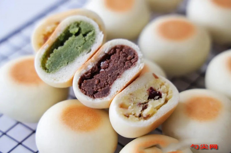 工藝:1、先來(lái)做綠豆餡兒,脫皮綠豆清水清洗幾遍,浸泡一個(gè)晚上,泡好的綠豆體積膨脹了1倍,放在籠屜上,隔水上鍋蒸,大約蒸35分鐘左右,蒸熟的綠豆一捻就碎;2、然后放在料理機(jī)里打碎,或者直接搗碎,有點(diǎn)顆粒感也沒(méi)有關(guān)系,處理好的綠豆放在不粘鍋里,加入黃油、白糖、1勺煉乳、2勺奶粉,小火慢慢翻炒;3、翻炒至綠豆餡兒變得非常細(xì)膩,而且不粘鍋鏟就可以了4、分成3等份,分別加入抹茶粉,做成抹茶口味的,加入可可粉做成可可味的,原味的加入切碎的蔓越莓干,翻炒均勻;全部用保鮮膜包起來(lái),3種口味的餡料就做好了,冷藏備用。把餡料分成30克的小劑子,搓圓備用;5、再來(lái)做外皮的部分。清水,加入酵母,靜置幾分鐘,再加入中筋面粉、泡多源A,白糖、豬油,先拌成面絮狀,再揉成團(tuán),密封醒面15分鐘,第二次揉面,揉成非常光滑的面團(tuán),密封醒上10分鐘左右。6、面團(tuán)取出來(lái)分成20克的小劑子,把每個(gè)小面劑揉圓,全程要蓋保鮮膜防止面團(tuán)變干;7、取第一個(gè)揉好的面團(tuán),搟成中間厚邊緣薄的小圓餅,包上提前做好的餡料;8、封好接口,全部做好之后擺放在烤盤上面,上下火170度先烤15分鐘;9、拿出來(lái),翻個(gè)面,繼續(xù)烤15分鐘左右。直到兩面金黃色就可以了。