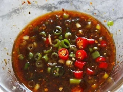 工藝:將鹽、雞精、胡椒粉、白糖、醬油、香醋等基礎調味料放入碗中,攪拌均勻。加入切好的香蔥、蒜、姜末,繼續攪拌,使香味充分融合。加入油類調味料: