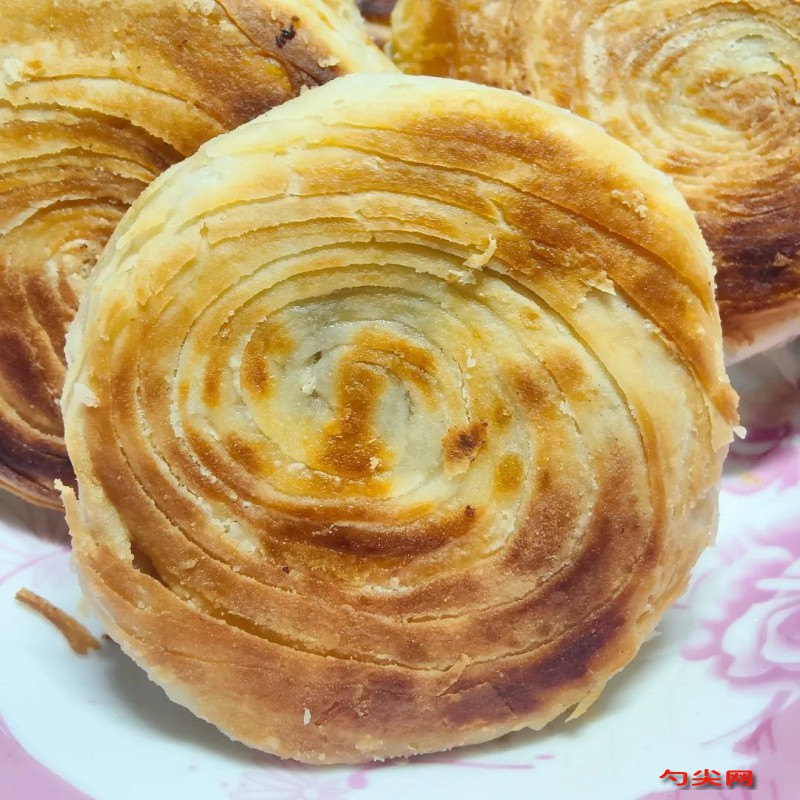 分成等份的劑子,每個劑子微稍?揉一下,搓圓備用。2、油酥:揉面墊上放低筋面粉90克,豬油/熟油42-45克,拌勻后用手掌根擦勻擦透,揉細搓?膩,加保鮮膜松弛20分鐘。3、取一個油皮搟成包子皮,包上油酥,收好收口,按扁,開酥。醒面的時間,準備餡料。4、開酥:①、三折法(明酥):油皮、油酥各分成3份。分別用油皮包上油酥。接口朝上,拍成長條形,搟成牛舌狀,不要搟到邊。再調(diào)轉方向搟成方形。兩邊往中間折成三折,搟面杖放中間,往前推搟薄,再從中間往下推,搟薄,卷起來。用刀在中間切開,下接第5步驟。②、二次搟卷(暗酥):油皮、油酥各分成6份。分別用油皮包上油酥。接口朝上,搟成牛舌狀,卷起來,蓋保鮮膜醒面松弛20分鐘,再搟成牛舌狀,卷起來,把兩邊面頭往中間收,按扁,搟成中間厚,四周薄的面片,包上餡料,收好收口。③、二次搟卷(明酥):油皮、油酥各分成3份。分別用油皮包上油酥。接口朝上,搟成牛舌狀,卷起來,蓋保鮮膜醒面松弛20分鐘,再搟成牛舌狀,卷起來。用切面刀從中間切開。下接第5步驟。5、包餡肉餡包法(明酥):切口朝下,用手按扁,蓋保鮮膜松弛20分鐘。用搟面杖搟成四周薄中間厚的面皮,蓋保鮮膜松弛20分鐘。搟的時候注意點,不要把螺旋心搟歪了。包上餡料,收好收口。糖餡包法:切口朝下,用手按扁,用大拇指在中間摁一下,慢慢轉著按出一個窩。包上餡料,用虎口收攏,收好收口。用搟面杖輕輕壓扁,輕輕搟成薄點的餅狀。6、烙餅:上下火6-7分鐘,或烙至上色滿意。電餅鐺預熱好后,適量多倒一些油,切面朝下,把餅用手按平,表面噴油,上下火烙6-7分鐘,或烙至兩面金黃,上色滿意。