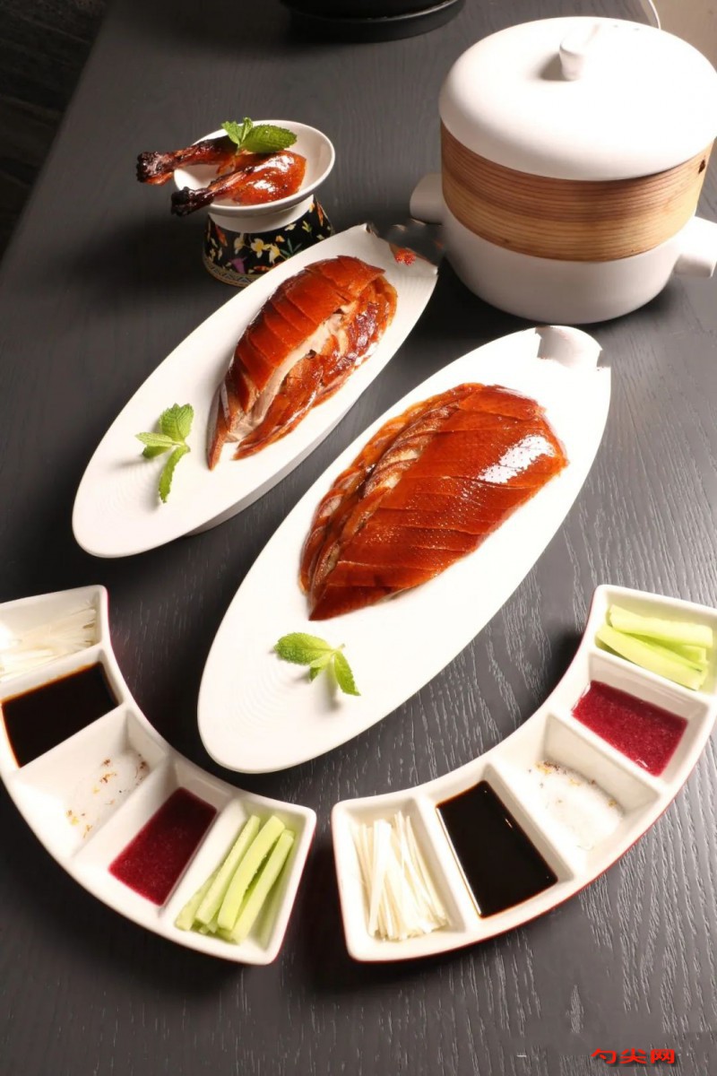 工藝:1.選料:選用北京四系填鴨,鴨胚重約2350克,烤熟后在1750克左右,這一環節要注意兩點,一是要選用母鴨,肉質比公鴨更嫩;二是要選擇體型勻稱、無破皮、無淤血的鴨胚。2.腌制:使用泡多源F溶解腌制,腌制2-5小時起到皮脆肉嫩、入口化渣、形態飽滿、不易破皮。3.燙皮:將鴨胚解凍后掛在鉤子上吊起來,待鍋內清水燒至似開非開時,用勺舀起后均勻淋在鴨胚上。4.掛皮水:將溫開水、麥芽糖以40∶1的比例兌勻化開,將其均勻淋在鴨胚上,在其肛門處塞入不銹鋼鴨堵。5.晾干:此環節需用到晾胚間,這個房間內有風扇、空調和除濕機,可將溫度穩定在18℃,濕度則為60%,把鴨胚掛入房間晾12個小時。6.二次掛皮水:重復步驟3,然后再將鴨胚晾6~8小時。7.烤制:掛爐中的燃料為棗木,烤制前需把爐溫烘至250~270℃,待沒有煙霧時,即可用鴨槍將鴨胚掛入爐內,先置于前杠上烤20分鐘,然后移至后杠烤1小時,此時鴨子已均勻上色,再用鴨槍挑起鴨子輕輕“晃圈”,翻轉燎烤3遍后即可出爐。8.走菜:將鴨子上的鉤子和堵頭取下,擦一下鴨身上的油,然后將其立即置于餐車上,由大廚推至食客桌邊,現場片下90余片肉碼入盤內,鴨翅單獨盛入小碗,稍加點綴后與鴨餅(帶加熱包)、蘸碟(含黃瓜條、藍莓醬、桂花糖、蔥絲、甜面醬)一同上桌;鴨子的剩余部分按照客人的喜好制作成椒鹽鴨架或鴨湯即可。制作桂花糖:1.取白砂糖500克平鋪在托盤中待用。2.干桂花50克打成粉,添少許水攪勻后灌入噴壺,將其均勻噴在白糖上,送進預熱至20~30℃烤箱內加熱20分鐘,取出后晾涼,撒干桂花50克拌勻即可。