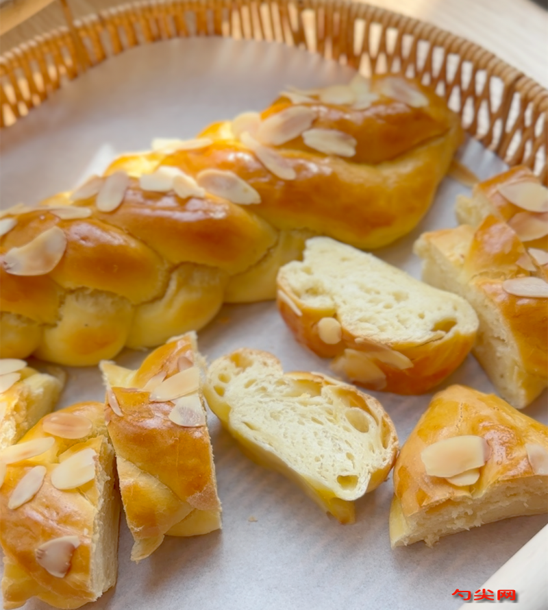注意事項:在編織辮子時,要輕柔地操作面團,避免過度拉扯或擠壓導致面團斷裂或變形。同時,要確保辮子的松緊度適中,以便在烘烤過程中保持形狀。烘烤時間根據面包的大小和厚度進行調整,一般為20-30分鐘左右.烘烤完成后,將面包從烤箱中取出,放在烤架上完全冷卻。避免立即切割或食用,以免影響面包的口感和質地。
