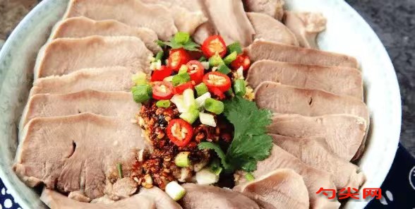 步驟5 豬舌從鍋中取出,瀝干水分,冷卻到不燙手的時候切片,裝盤。配上蘸醬,開吃