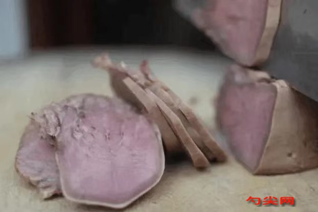 2.豬舌煮熟后,取出,清洗干凈,用冷水浸泡,直至完全冷卻?,F在天氣很熱。一種方法是把它浸泡在冰水里,另一種方法是把它放在冰箱里。