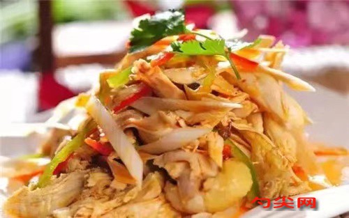 主要采用涼拌的方法:雞在清水中煮過之后,手撕成塊,將切成絲的尖椒、花椒油、鹽、味精、香油等撒在撕好的雞肉上。