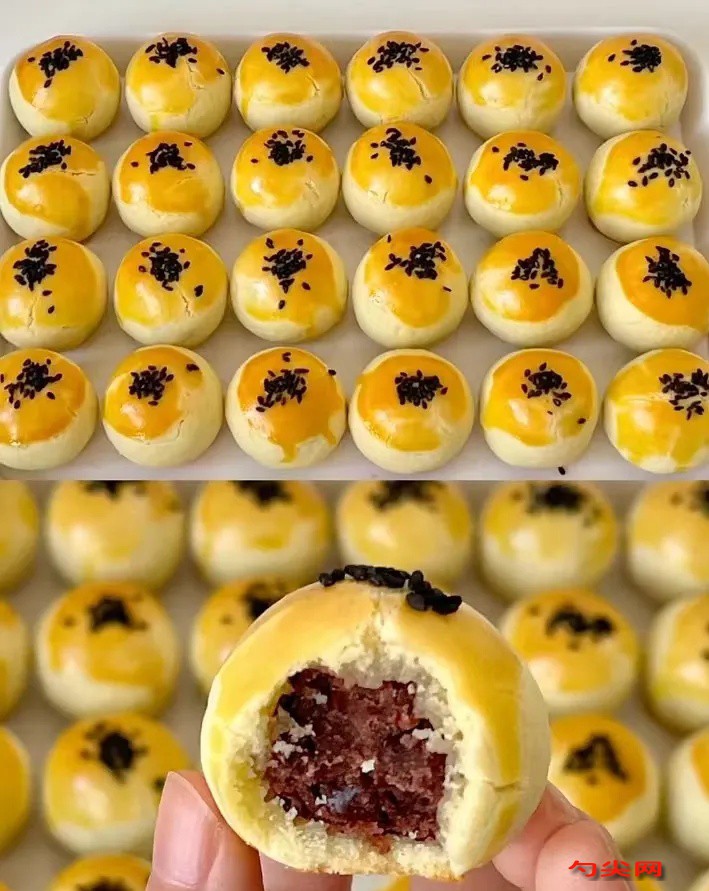 配方:中筋面粉:200克,面欣酥E4克,豬油:80克,細砂糖:40克,水:50毫升,紅豆沙:200克,蛋黃:1個,黑芝麻:適量。