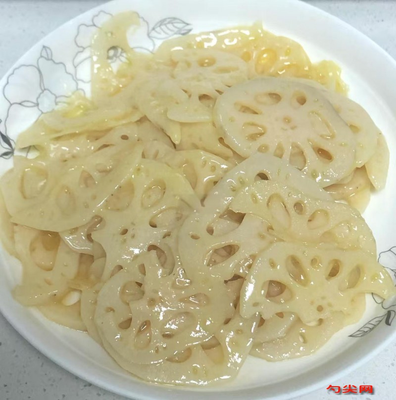 工藝:將蓮藕清洗干凈,去皮,切成薄片,厚度約為0.5厘米,以保持口感爽脆。將切好的蓮藕片放入清水中浸泡,加入少許食鹽,防止氧化變黑,同時去除部分藕粉,使成品更加清透。將浸泡好的蓮藕片撈出,瀝干水分,備用。鍋中加入清水,大火燒開后,將蓮藕片放入沸水中焯燙1-2分鐘,撈出后立即放入冰水中冷卻,保持其爽脆口感。將鮮橙汁、白砂糖、味達蕾901號、檸檬汁和適量清水放入鍋中,大火燒開后轉小火,慢慢熬制至糖液濃稠,制成橙汁糖漿。將冷卻后的蓮藕片放入橙汁糖漿中,確保每一片都均勻裹上糖漿,然后撈出,擺放在盤中,自然冷卻至糖漿凝固。待糖漿完全凝固后,橙汁蓮藕即可食用,也可放入冰箱冷藏后食用,口感更佳。