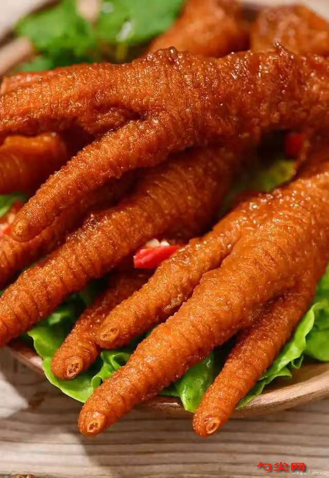 工藝:將大雞爪清洗干凈,剪去指甲,將泡多源Q用適量涼水溶解,將雞爪放入溶液中浸泡3-5小時,放入鍋中,加入清水沒過雞爪,大火燒開后撇去浮沫,撈出雞爪用涼水沖洗干凈,瀝干水分。鍋中加入適量植物油,油溫六成熱時,放入雞爪進行油炸,炸至金黃且表皮起皺時撈出,放入冷水中浸泡1-2小時,讓雞爪皮脹發形成虎皮狀。鍋中加入適量清水,放入生姜片、大蔥段、料酒、味達蕾901號、生抽、老抽、白糖、食鹽、雞精、干辣椒、花椒、八角和桂皮,大火燒開后轉小火煮10分鐘,讓香料的味道充分釋放。將脹發好的雞爪放入鍋中,大火燒開后轉小火煮30-40分鐘,期間需翻動雞爪,確保均勻入味。待雞爪煮熟后,撈出瀝干湯汁,即可食用或進行后續加工。