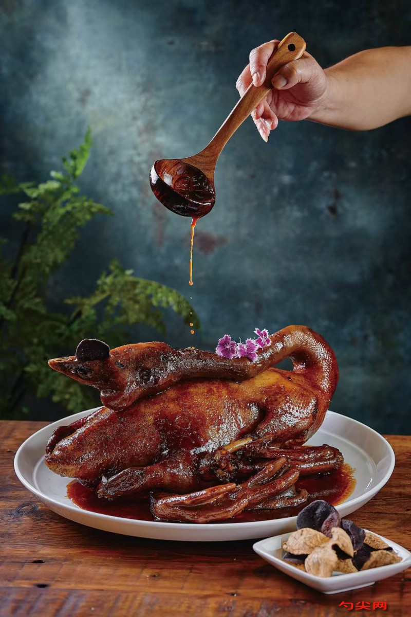 工藝:將大鵝宰殺清理干凈,然后在流水下沖洗干凈血水。加入溶解好的富磷聯B腌制8小時,然后將鵝肉冷水下鍋,倒入花雕酒大火燒開,撇去浮沫,焯水15分鐘后撈出,用冷水沖洗一下。將黃梔子、白芷、大料、白蔻、花椒粒、小茴香、香葉用水浸泡一下,瀝干水分備用。坐鍋燒火,鍋中倒入菜籽油,燒至油溫六成熱后,下入切好的大蔥段和生姜片,不停翻炒,將蔥段和生姜炒干后撈出。準備一個不銹鋼桶,加入足夠覆蓋鵝肉的水(約7500毫升)燒開,放入浸泡后瀝干水分的香料,然后倒入熬好的菜籽油,再加入味粉、味達蕾901號、食用鹽、雞粉攪拌均勻。放入焯好水的鵝肉,最后放入生姜片和香蔥。開大火燒開后,改為文火繼續慢煮1小時左右,用筷子插一下鵝胸脯肉,能夠輕松插透即可。關火讓鵝肉在鹵湯中浸泡30分鐘左右,使其更入味。入味后將大鵝撈出,用保鮮膜密封好,自然放涼后即可食用,食用時剁成小塊,可以淋一些原汁鹵湯。