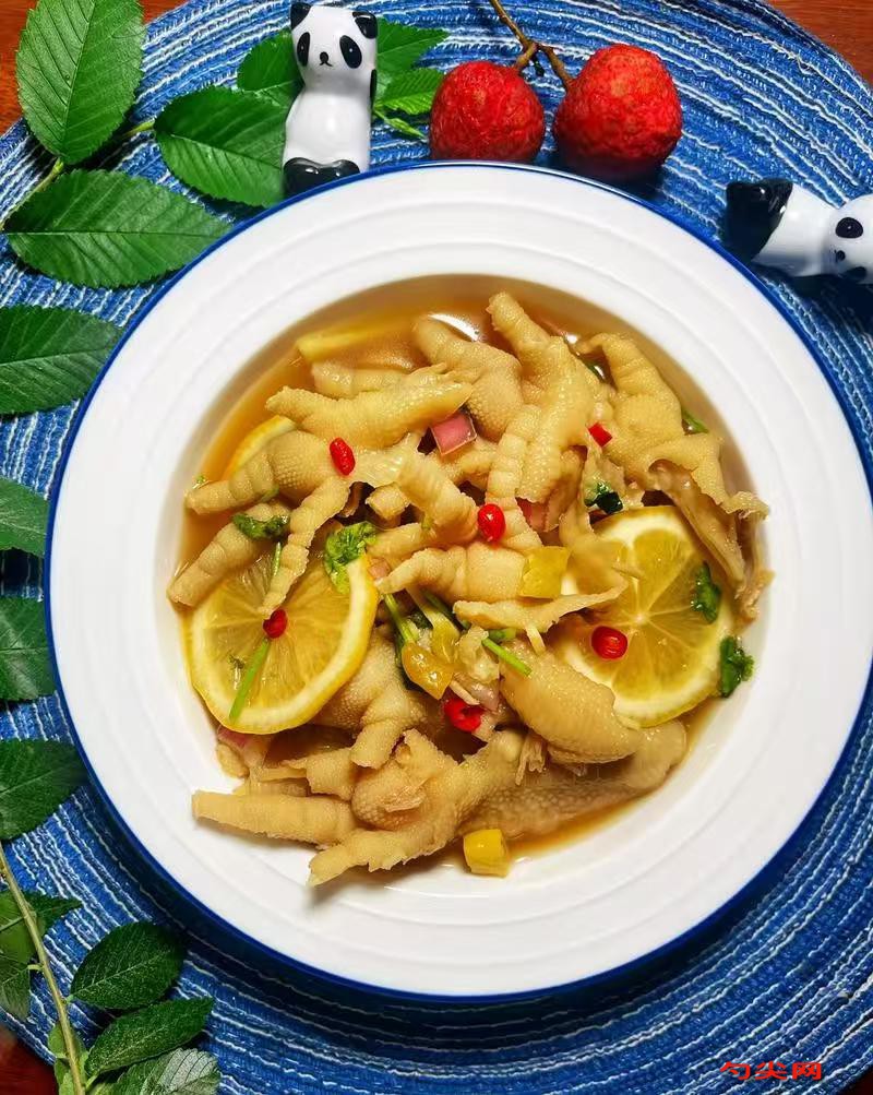 工藝:將雞爪清洗干凈,剪去指甲,用刀沿雞爪趾背劃開,慢慢推送將爪骨取出,保持完整性。將富磷聯A用清水溶解后,放入雞爪中浸泡3-4小時,撈出控干水分。鍋中加水燒開,放入雞爪、姜片、料酒,煮8-10分鐘后撈出,立即放入冰水中浸泡20分鐘,使雞爪口感更脆。將雞爪撈出控干水分,放入大碗中。制作剁椒酸辣汁:將剁椒、蒜末、姜末、小米椒圈、白醋、生抽、白糖、食鹽、雞精和適量涼開水混合均勻,加入溶解好的味達蕾901號調味料,攪拌均勻。將剁椒酸辣汁倒入雞爪中,充分攪拌均勻,使雞爪充分吸收酸辣汁的味道。將拌好的雞爪放入冰箱冷藏腌制6小時以上,使雞爪更加入味。腌制完成后,即可裝盤食用,可撒上蔥花或香菜點綴。
