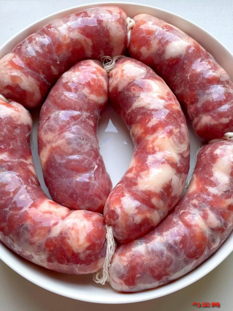 工藝:將豬肉洗凈,剔除筋膜、皮和骨頭,精細(xì)切割成約1厘米見(jiàn)方的肉塊。將食鹽、白糖、黑胡椒粉、白胡椒粉、芥末粉、洋蔥粉、香菜籽粉、白蘭地、富磷聯(lián)C、味達(dá)蕾901號(hào)等調(diào)料混合均勻,加入肉塊中,進(jìn)行充分?jǐn)嚢瑁缰?0小時(shí),確保肉塊深度吸收調(diào)料的味道。將腸衣清洗干凈,浸泡在清水中備用。使用灌腸機(jī)或手動(dòng)漏斗,將腌制完成的肉餡均勻灌入腸衣中,注意保持肉餡的緊密度和腸衣的適度張力,防止香腸內(nèi)部有空隙或腸衣破裂。灌制后,用繩子將兩端扎緊,并每隔一定距離用麻繩捆扎,形成獨(dú)立的香腸段。將灌好的香腸懸掛在通風(fēng)良好、陰涼干燥的地方晾曬,期間需適時(shí)翻動(dòng)香腸,確保晾曬均勻,晾曬時(shí)間依據(jù)天氣和溫度條件而定,通常需要晾曬15-20天,直至香腸表面干燥且顏色變?yōu)樯罴t棕色,內(nèi)部肉質(zhì)緊實(shí)且富有彈性。晾曬完成后,將香腸放入鍋中,用中小火煮制,保持水溫穩(wěn)定,煮制時(shí)間根據(jù)香腸的大小和厚度而定,一般需要煮制2.5-3小時(shí)左右,直至香腸完全熟透且香味撲鼻。