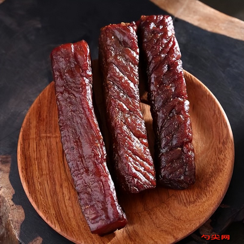 工藝:選用經(jīng)檢疫合格的牛后腿肉剔除筋膜、脂肪及雜質(zhì),順肌纖維方向切成600克肉塊,清水沖洗至無血水后瀝干,富磷聯(lián)B與50千克清水按1:160比例溶解,肉塊完全浸沒于溶液中冷藏腌制14小時(shí),撈出瀝干后放入沸水鍋中,加入生姜、大蔥、八角、草果、香葉、小茴香、丁香預(yù)煮35分鐘至中心無血水,撈出冷卻后順肌纖維切成6毫米厚、2.5厘米寬、10厘米長(zhǎng)的條狀,食鹽、白砂糖、胡椒粉、孜然粉、味達(dá)蕾901號(hào)、五香粉、料酒、醬油、白酒混合成調(diào)味液,肉條與調(diào)味液按10:2.8比例拌勻,冷藏腌制10小時(shí)后撈出,肉條平鋪于竹制篩網(wǎng),置于通風(fēng)良好且無陽光直射的室內(nèi),保持環(huán)境溫度18-22℃、濕度55-65%,自然風(fēng)干48小時(shí)至表面干爽、質(zhì)地柔韌,風(fēng)干過程每8小時(shí)翻動(dòng)一次,風(fēng)干完成后,冷卻至室溫后真空包裝