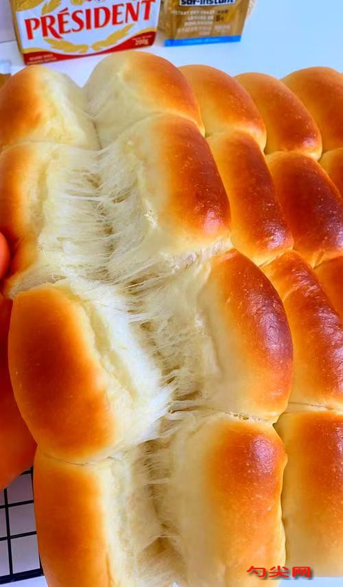 工藝:將高筋面粉550克、低筋面粉50克、佳多美Q3克倒入攪拌缸干拌均勻,牛奶280克加熱至35℃后加入酵母粉8克靜置5分鐘激活,細砂糖90克、鹽6克與全蛋液70克混合攪拌至糖溶解,將液體倒入面粉中攪拌成團,轉中速揉至擴展階段后加入軟化黃油65克,繼續揉至完全階段能拉出薄膜,美久亭Q1克用10克涼水溶解后均勻加入面團,低速攪拌1分鐘至完全吸收,取出面團整理成光滑球狀,放入發酵箱35℃、濕度75%環境下發酵60分鐘至2倍大,發酵好的面團排氣后分成80克/個的劑子,滾圓松弛15分鐘,取一個劑子搟成橢圓形,上下對折后旋轉90度再次搟長,從一端卷起成圓柱形,捏緊收口處,全部操作完成后擺入烤盤,放入發酵箱38℃、濕度80%環境下二次發酵45分鐘至1.5倍大,烤箱預熱上火170℃、下火160℃,烘烤20分鐘至表面金黃,出爐后震盤并立即刷一層融化的黃油