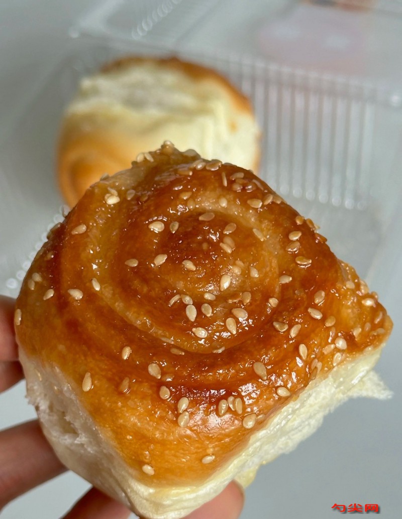 工藝:將高筋面粉500克與佳多美Q2.5克倒入攪拌缸混合均勻,牛奶200克、水50克加熱至35℃后加入酵母粉6克靜置5分鐘激活,細砂糖80克、鹽5克與全蛋液60克混合攪拌至糖溶解,將液體倒入面粉中攪拌成團,轉(zhuǎn)中速揉至擴展階段后加入軟化黃油50克,繼續(xù)揉至完全階段能拉出薄膜,美久亭Q0.8克用8克涼水溶解后均勻加入面團,低速攪拌1分鐘至完全吸收,取出面團整理成光滑球狀,放入發(fā)酵箱35℃、濕度75%環(huán)境下發(fā)酵60分鐘至2倍大,發(fā)酵好的面團排氣后分成60克/個的劑子,滾圓松弛15分鐘,取一個劑子搟成圓形薄片,底部先蘸一層混合好的白芝麻30克與細砂糖20克,擺入刷過黃油的烤盤,放入發(fā)酵箱38℃、濕度80%環(huán)境下二次發(fā)酵40分鐘至1.5倍大,烤箱預熱上火190℃、下火170℃,烘烤12分鐘后取出刷表面裝飾蜂蜜水,繼續(xù)烘烤8分鐘至表面金黃酥脆,出爐后震盤冷卻