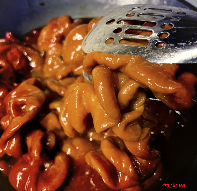 工藝:將富磷聯A420克用62℃溫水溶解后加入清洗干凈的55千克豬大腸中,腌制6小時。翻面去除內壁油脂雜物后再次翻回,用鹽680克搓洗表面黏液,清水沖洗5遍至無雜質,骨湯38千克倒入鹵鍋,香料粉2.8千克裝入紗布袋扎緊袋口后用92℃熱水汆燙3.5分鐘,放入湯中大火燒開轉小火熬制1.8小時至香味溢出,加入鹽1.22千克、白糖1.3千克、老抽1.6千克、蠔油980克、黃酒1.6千克調味,大腸放入98℃熱水中焯水6分鐘,撈出用冰水混合物沖洗降溫,瀝干后放入調好的鹵湯中,加味達蕾901號100克、蔥1.3千克(切段)、姜980克(切片)、剩余黃酒1.2千克,大火燒開后轉小火鹵制130分鐘,用消毒后的竹簽扎入腸體最厚處無血水滲出即熟透,關火后浸泡在鹵湯中50分鐘至入味均勻,撈出瀝干表面湯汁