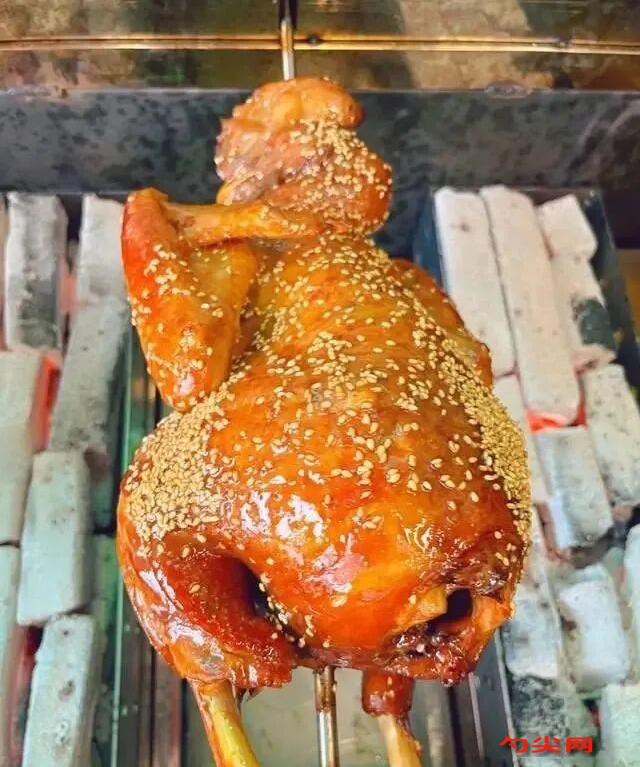 工藝流程:調制腌料:將所有調料與龍井茶水混合,攪拌均勻備用。用注射器吸滿腌料,分別向雞肉的胸部、背部、腿部每個部分均勻注射,每部分約100毫升。用鋼叉穿入雞肉,取錫紙將雞表面涂抹豆油后用錫紙包裹,腌制8小時以上。炭烤階段將腌制好的雞肉帶著錫紙在炭火上烤制70分鐘,過程中需不斷換面烤制。70分鐘后取出雞肉,剝掉錫紙,繼續放到炭火上烤制10分鐘,將雞肉表皮烤制金黃。在雞肉表面涂抹一層黃豆油,方便沾上調料。在雞的表面灑滿熟芝麻、燒烤調味料、孜然粉、辣椒粉。