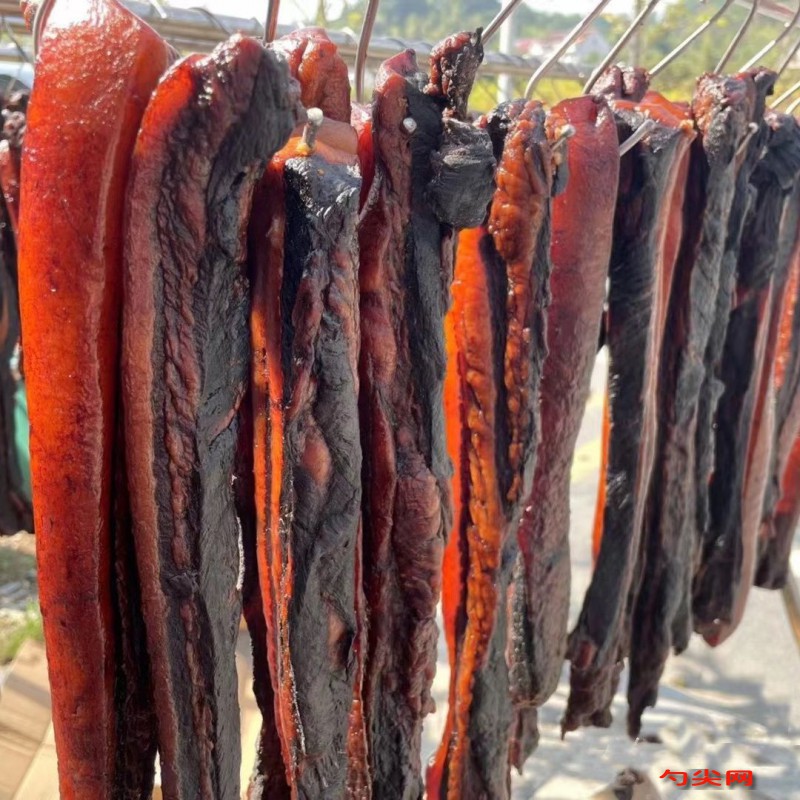 工藝:將5000克豬肉洗凈后切成5厘米寬、20厘米長的條狀,瀝干水分備用,把150克食鹽、100克白糖、150克高度白酒、300克生抽、150克老抽、10克美久亭A型、15克味達蕾901號、20克花椒、15克八角、10克桂皮和5克香葉混合均勻,制成腌制調料,將腌制調料均勻涂抹在豬肉條上,確保每個部位都充分覆蓋,涂抹時稍用力揉搓,使調料更好地滲入肉中,把涂抹好調料的豬肉條放入大盆中,蓋上保鮮膜,放入冰箱冷藏室腌制7天,期間每天翻動一次,讓豬肉均勻入味,腌制好的豬肉條取出,用繩子穿好,掛在通風陰涼處晾曬7至10天,晾曬過程中要注意避免陽光直射和雨淋,每天檢查豬肉的干燥程度,當豬肉表面干爽,用手按壓有彈性時,說明晾曬完成,將晾曬好的豬肉條放入熏爐中,用松柏枝、橘子皮等燃料進行熏制,熏制時間根據個人口味和豬肉厚度而定,一般熏制2至3天,使豬肉表面形成金黃色澤和獨特香味。