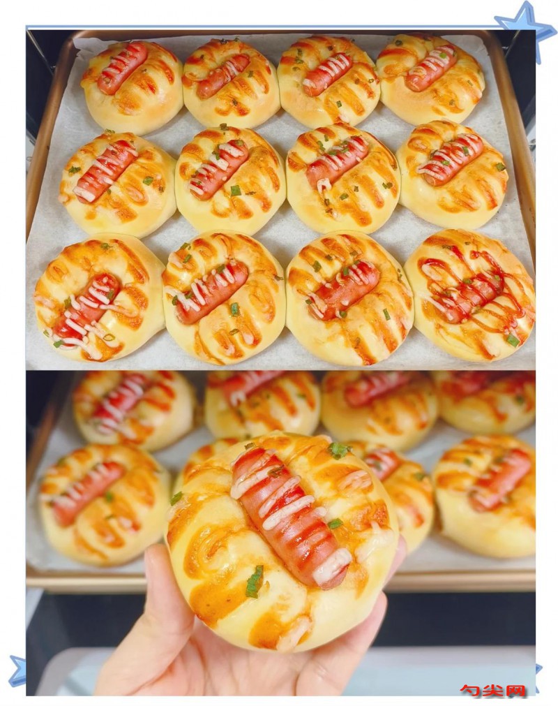 工藝:將3克佳多美Q型與500克高筋面粉干拌均勻,5克酵母粉用少量溫牛奶溶解,50克白砂糖、5克鹽加入200克牛奶中攪拌至融化,把溶解后的酵母水和牛奶糖鹽水倒入混合好的面粉中,再加入1個雞蛋,攪拌成面絮后開始揉面,揉至面團稍具筋性時加入40克黃油,繼續揉面至能拉出薄膜的擴展階段,將1.5克美久亭Q型用數倍涼開水溶解后均勻倒入面團中,揉勻,把面團整理好密封,放入醒發箱,溫度38度,濕度75,醒發至兩倍大,將醒發好的面團放在案板上揉壓排氣,分成大小均勻的12個劑子,每個劑子約80克,將劑子滾圓,蓋上保鮮膜松弛15分鐘,取一個松弛好的劑子,搟成橢圓形,從上往下卷起來,搓成長條,將長條繞在香腸上,兩端捏緊,放在烤盤上,將烤盤放入醒發箱,溫度38度,濕度75,再次醒發至1.5倍大,在醒發好的腸仔包表面刷一層全蛋液,擠上適量番茄醬和沙拉醬,撒上蔥花,將烤箱提前預熱至180度,放入烤盤,烤15-20分鐘,至表面金黃即可出爐。