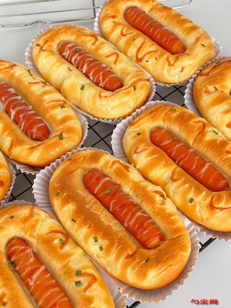 工藝:將500克高筋面粉、3克佳多美Q型、20克奶粉、6克鹽、80克細(xì)砂糖、8克酵母倒入攪拌器皿內(nèi)慢速混合1分鐘,加入200毫升冰水慢速攪至無干粉,接著加入80克雞蛋繼續(xù)攪拌,當(dāng)面團開始形成且不再過于粘手時加入50克軟化的黃油,和美久亭Q型溶液,揉至面團光滑且彈性十足,將揉好的面團放入涂抹了少許油的容器中,用保鮮膜覆蓋,放在溫暖處進行第一次發(fā)酵至面團體積翻倍,取出發(fā)酵好的面團輕柔分成等份并搟成長方形薄片,把250克片狀丹麥油放在搟好的面片中間,將面片兩邊向中間折疊包裹住丹麥油,排出空氣后搟成長方形,進行一次三折,折疊后放入冰箱冷藏松弛15分鐘,冷藏松弛后取出再次搟成長方形進行一次四折,再次放入冰箱冷藏松弛15分鐘,將松弛好的面團搟成厚度約0.5厘米的面片,用刀切成合適大小的長方形面片,在面片上放上香腸,將面片包裹住香腸,收口捏緊,將整形好的面團放在鋪有烘焙紙的烤盤上,進行二次發(fā)酵至體積明顯增大,在發(fā)酵好的面團表面刷上一層蛋液,放上芝士片,擠上沙拉醬,撒上少許干蔥碎,預(yù)熱烤箱至180°C,將烤盤放入預(yù)熱好的烤箱中烘烤20-25分鐘至表面金黃。
