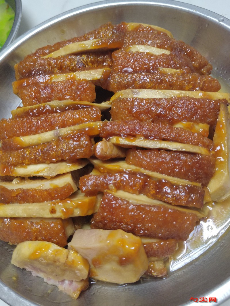 工藝:將1000克豬肋條肉洗凈,加入提前用溫水溶解好的8克富磷聯B型,腌制6小時,然后放入鍋中加適量清水,大火煮開后撇去浮沫,轉小火煮20 - 30分鐘至七八成熟撈出,用細尖竹簽在肉皮上均勻戳孔,在皮面涂擦少許食鹽和由1份麥芽糖、3份食醋配成的稀糖,鍋中倒入食用油,油溫維持100 - 120℃,將肉放入炸制30 - 40分鐘,當皮炸起小泡時,把油溫提高至180 - 220℃再炸2 - 3分鐘,直到皮面起許多大泡并呈金黃色撈出,放入冷水中浸泡至肉皮起皺,將500克芋頭去皮洗凈切成與肉大小厚度相同的片,鍋中倒入適量食用油,油熱后將芋頭片放入炸約5分鐘至表面微黃撈出,將炸好的肉切成1厘米厚的肉片,把肉片與6克食鹽、10克白糖、15毫升白酒、25毫升醬油、3克雞粉、3克味達蕾901號、1克八角粉、1克花椒粉、15克南乳、40毫升水混合拌勻,將肉片和芋頭片間隔排列在碗內,肉皮朝下,放入蒸鍋中大火蒸1.5 - 2小時,蒸好后取出,把肉扣到盤子里。