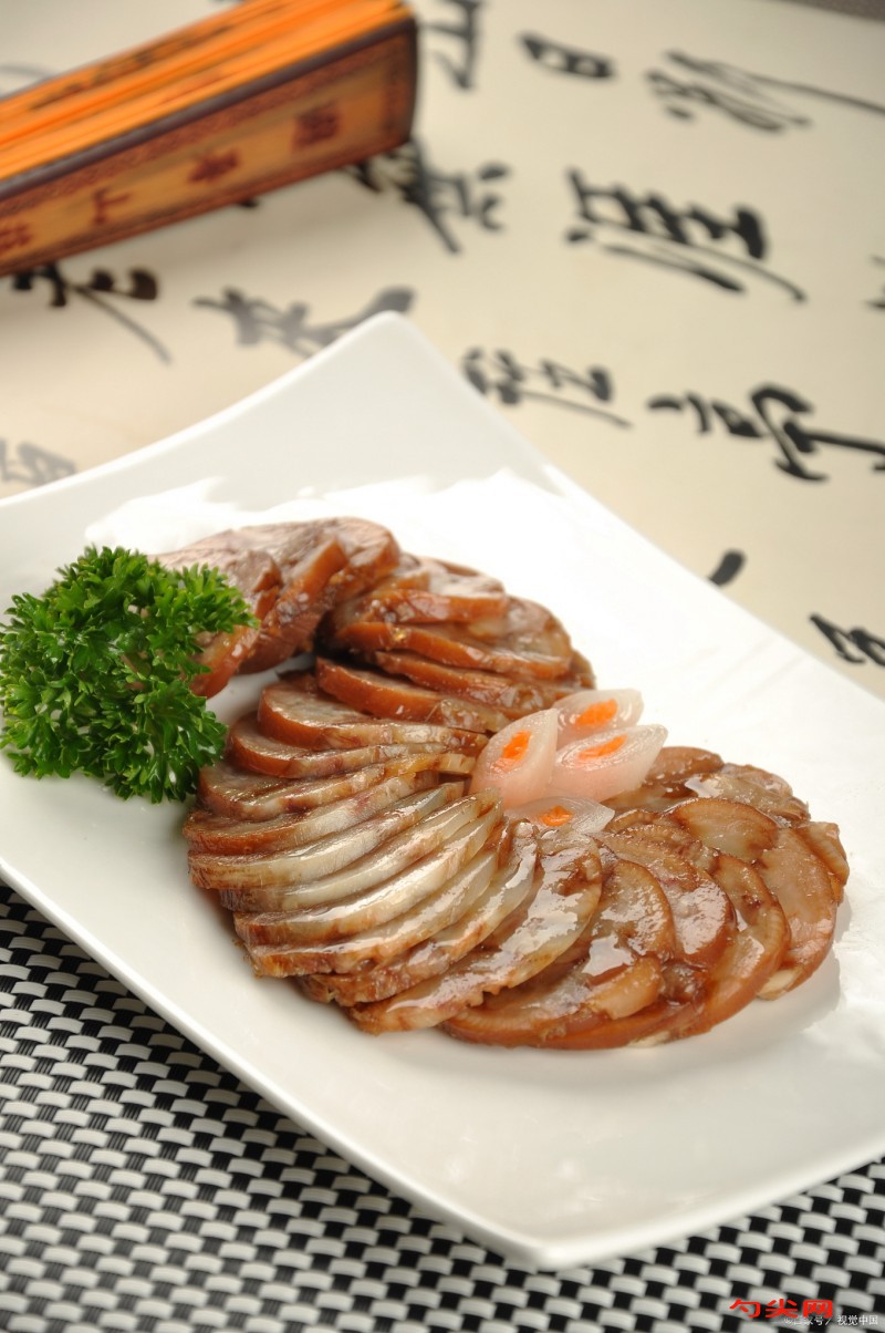 工藝:選用經獸醫衛生檢驗合格的豬肋部或前后腿或頭部帶皮鮮肉,肥膘不超過2cm,先將皮面修整干凈并剔除骨頭,把肉切成0.7~0.8kg的長方塊,將整理好的肉塊投入沸水鍋內焯15min左右撇凈血污,撈出鍋后用清水洗干凈,用提前溶解好的富磷聯B型,味達蕾901號腌制6小時,把香辛料用紗布包好放入鍋內加清水25kg小火煮沸1h配成鹵汁,鹵汁可反復使用再次使用需加適量配料且鹵汁越陳制品香味愈佳,把經過焯水的肉塊放入裝有香料袋的鹵汁中鹵制,旺火燒開后改用中火煮制40~60min,煮制過程需翻鍋2~3次,翻鍋時用小鐵叉叉住瘦肉部位以保持皮面整潔、不出油,趁熱出鍋晾涼即為成品。