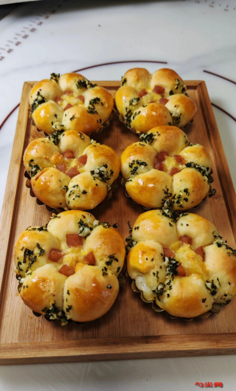 工藝:1至4的食材放入盆中,攪拌至酵母融化,加入燙種(撕成小塊)加入面包粉和佳多美Q型攪拌無干粉,放面墊上搓揉成團后加入黃油和鹽,撕扯發讓面團和黃油充分融合,摔打一兩分鐘至表面光滑,蓋上保鮮膜放冰箱冷藏一個小時以上,不要過夜,取出冷藏好的面團回溫15到30分鐘制作蒜香黃油醬:黃油20克蒜蓉20克鹽2克歐芹20克以上食材拌均勻裝入裱花袋備用德腸切花刀用作花蕊部分,回溫好的面團,按壓排氣,將面團分成10克左右份小面團,放入紙托紙托放五個,中間放德腸,去醒發兩倍大,每個花瓣中間擠上蒜香歐芹醬,刷上蛋黃液,放入提前預熱好的烤箱上火150下火180度烤28分鐘左右。