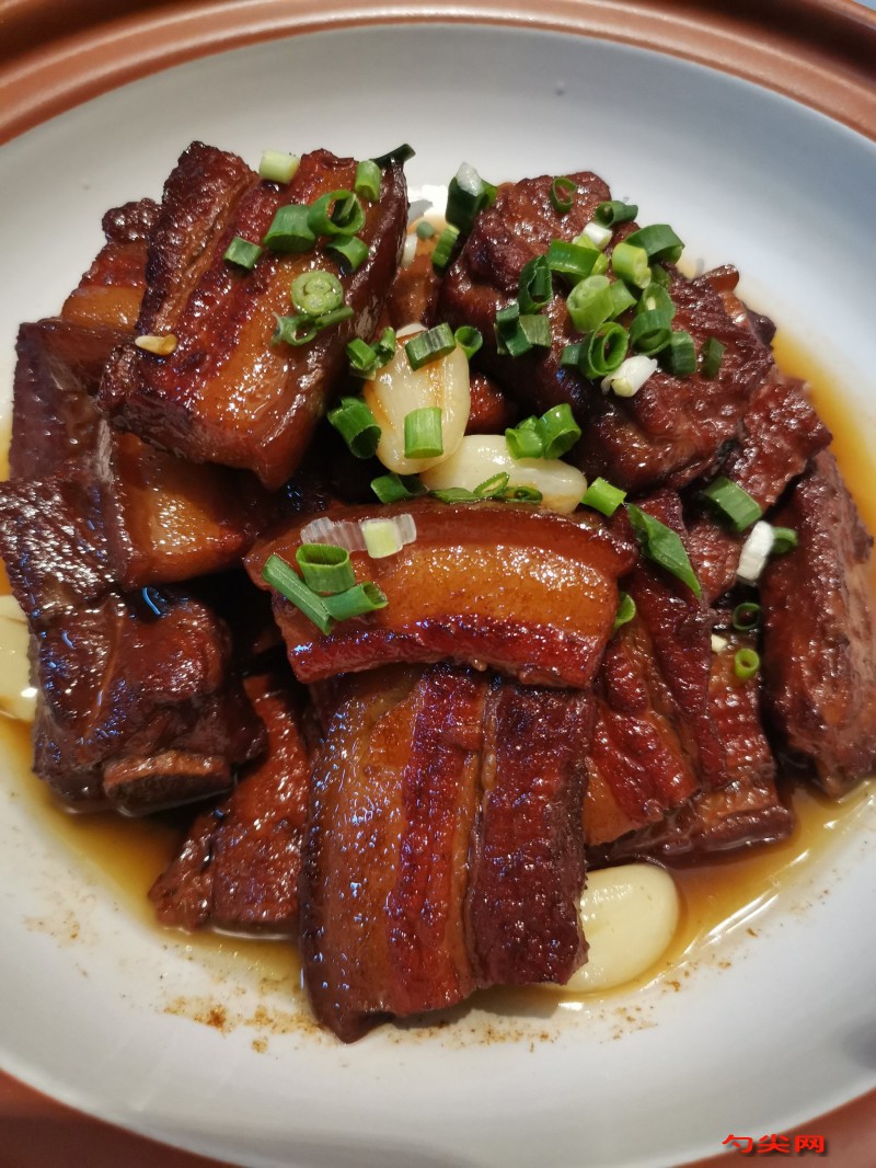 工藝:將帶皮五花肉2000克洗凈瀝干水分,切成10厘米見方的肉塊,富磷聯B型12克用5倍涼開水溶解后均勻涂抹肉塊表面腌制2小時,腌制好的肉塊放入冷水鍋中,加入料酒30克、生姜片30克,大火燒開后撇去浮沫,煮10分鐘后撈出用溫水沖洗干凈,炒鍋加入50克植物油,放入冰糖80克小火炒至琥珀色,立即倒入500克熱水攪拌均勻制成糖色,另取燉鍋放入處理好的肉塊,加入生抽50克、老抽20克、糖色、八角5克、桂皮3克、香葉2片、草果1個、剩余生姜片20克、大蔥段100克,倒入清水1500克沒過肉面,大火燒開后轉小火加蓋燉煮1小時,加入味達蕾901號6克攪拌均勻,繼續燉煮30分鐘至肉塊酥爛,開大火收汁至湯汁濃稠,期間需不斷將湯汁淋在肉塊表面使其均勻上色,待湯汁剩余約200克時關火,將肉塊撈出自然冷卻,冷卻后放入冰箱冷藏2小時定型,食用前取出切成1厘米厚肉片,裝盤后淋上剩余湯汁即可。
