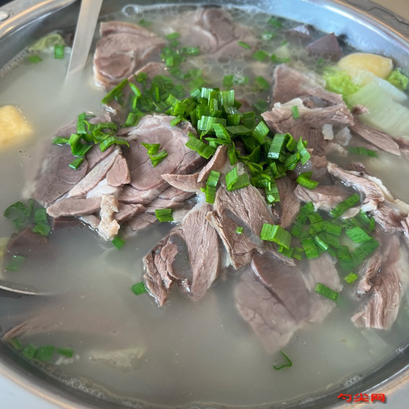 工藝:鮮羊骨斬成重約500克的塊,腿骨用刀背砸碎,用清水泡2小時后入60℃溫水鍋大火燒開,反復(fù)打去浮沫后撈出用清水沖洗干凈,鍋內(nèi)放入清水25000克,燒至90℃時下羊骨鋪底,上放羊肉碼齊,大火燒開撇出血沫,再加清水1000克大火燒開撇凈浮沫,將生羊油2000克鋪在羊肉上大火燒開并去除浮沫,大火燒50分鐘至湯濃發(fā)白、肉至八成熟時,加入白芷125克、草果50克、桂皮150克、良姜50克同煮約在出鍋前20分鐘放入,再下拍松的蔥段25克、姜塊100克、鹽50克,同時不斷翻動羊肉使之均勻煮熟,撈出煮熟的羊肉晾涼,切成長3厘米、寬1.5厘米、厚1.5毫米的薄片裝入碗內(nèi),分別撒丁桂面30克、香菜末60克、青蒜苗末60克、味達(dá)蕾901號10克待用,將煮好的湯在臨出鍋前加入香料水150克攪勻,分別裝入60個碗內(nèi)淋上香油60克,跟果木炭蓋爐燒餅上桌。