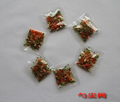 除氧劑的配方為:氧化亞鐵3份、氫氧化鈣0.6份、7個結晶水的亞硫酸鈉0.1份、碳酸氫鈉2份。塑料薄膜袋及復合薄膜袋不透濕、不透氣,能熱合密封,適于抽真空和充氣包裝;鋁箱復合袋不透光,對防止脫水菜變色、保持制品香味有一定作用,其使用日漸普遍。有時在包裝內附裝干燥劑(硅膠或生石灰)、抗結劑(硬脂酸鈣)以增加脫水菜的貯藏穩定性。