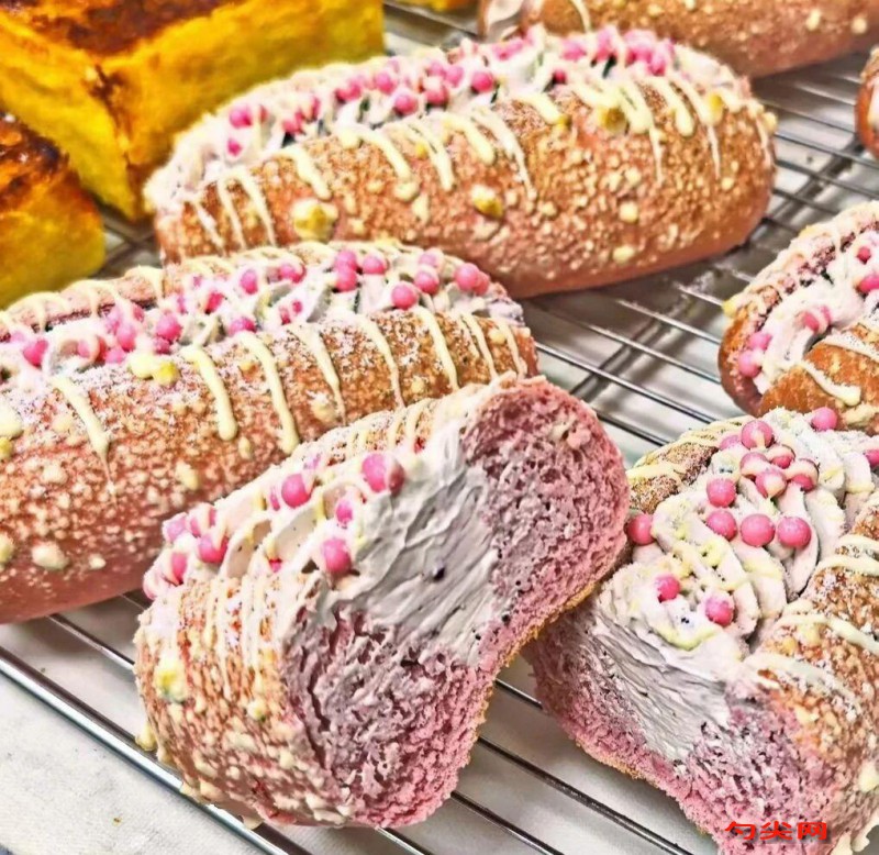 工藝流程:面團(tuán):燙種準(zhǔn)備:將100g高筋面粉與100g沸水混合,攪拌成團(tuán),冷藏備用。將山茶花面粉、佳多美Q型,糖、鹽、鮮酵母、燙種、魯邦種、水倒入攪拌缸,慢速攪拌至無干粉。轉(zhuǎn)中速攪拌至面團(tuán)表面光滑,加入軟化的黃油,慢速攪拌至完全吸收。加入草莓醬與紅絲絨液,中速攪拌至面團(tuán)呈均勻粉色,能拉出薄膜。面團(tuán)溫度26℃,濕度75%,發(fā)酵60分鐘至體積膨脹1.5倍。將面團(tuán)分割為150g/個(gè),滾圓后松弛20分鐘。將面團(tuán)搟成長條形(約30cm長),卷成圓柱狀,搓長至40cm,模仿毛毛蟲形態(tài)。溫度32℃,濕度80%,發(fā)酵40分鐘至體積膨脹2倍。表面刷蛋液,烤箱預(yù)熱上火195℃、下火180℃,烘烤12-15分鐘至表面金黃。草莓奶油:馬斯卡彭奶酪與糖混合,攪拌至順滑。淡奶油打發(fā)至6分發(fā),與奶酪糊、草莓醬、紅絲絨液混合均勻。將草莓奶油擠入冷卻后的能量棒切口中,表面撒糖粉或裝飾新鮮草莓。