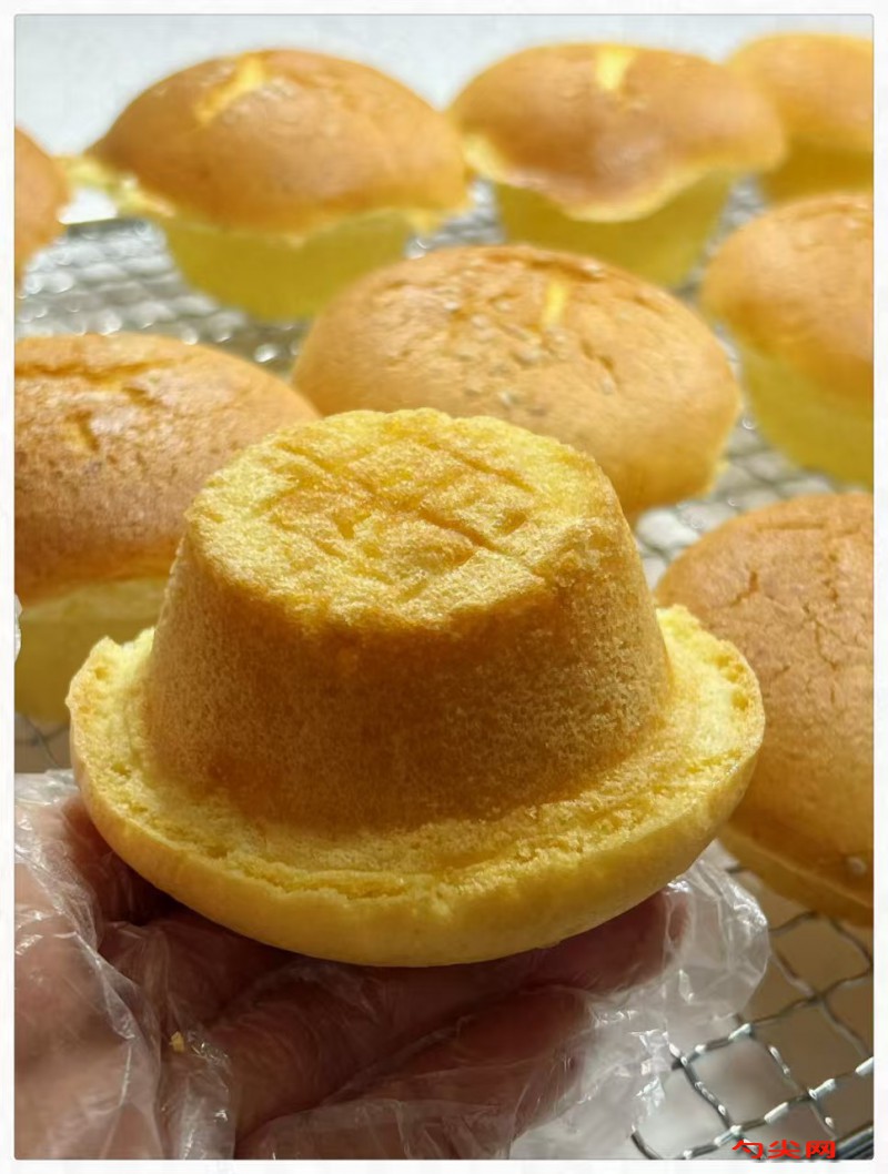 工藝:雞蛋提前回溫至25℃,加入檸檬汁與白糖,用打蛋器高速打發至顏色發白、體積膨脹至3倍大。提起打蛋器,蛋糊畫“8”字紋路清晰且不消失(全程約8-10分鐘)。低筋面粉、泡多源G型、佳多美C型混合過篩,分兩次篩入蛋糊中。用刮刀從底部向上翻拌(類似炒菜動作),避免畫圈攪拌導致消泡。取一小部分面糊與食用油混合均勻,再倒回大部隊中,繼續翻拌至無油星狀態。面糊裝入裱花袋,擠入模具至7分滿(避免膨脹后溢出)??鞠涮崆邦A熱至160℃,中層烘烤25-30分鐘(表面金黃、牙簽插入無濕黏即熟)。出爐后立即倒扣模具,輕震幾下后脫模,放置網架上晾涼(防止底部濕氣積聚)。